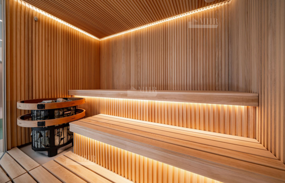 СПА-зона: бассейн с противотоком, сауна из абаши( африканское дерево), хамам, джакузи, с/у, душевая, раздевалка.