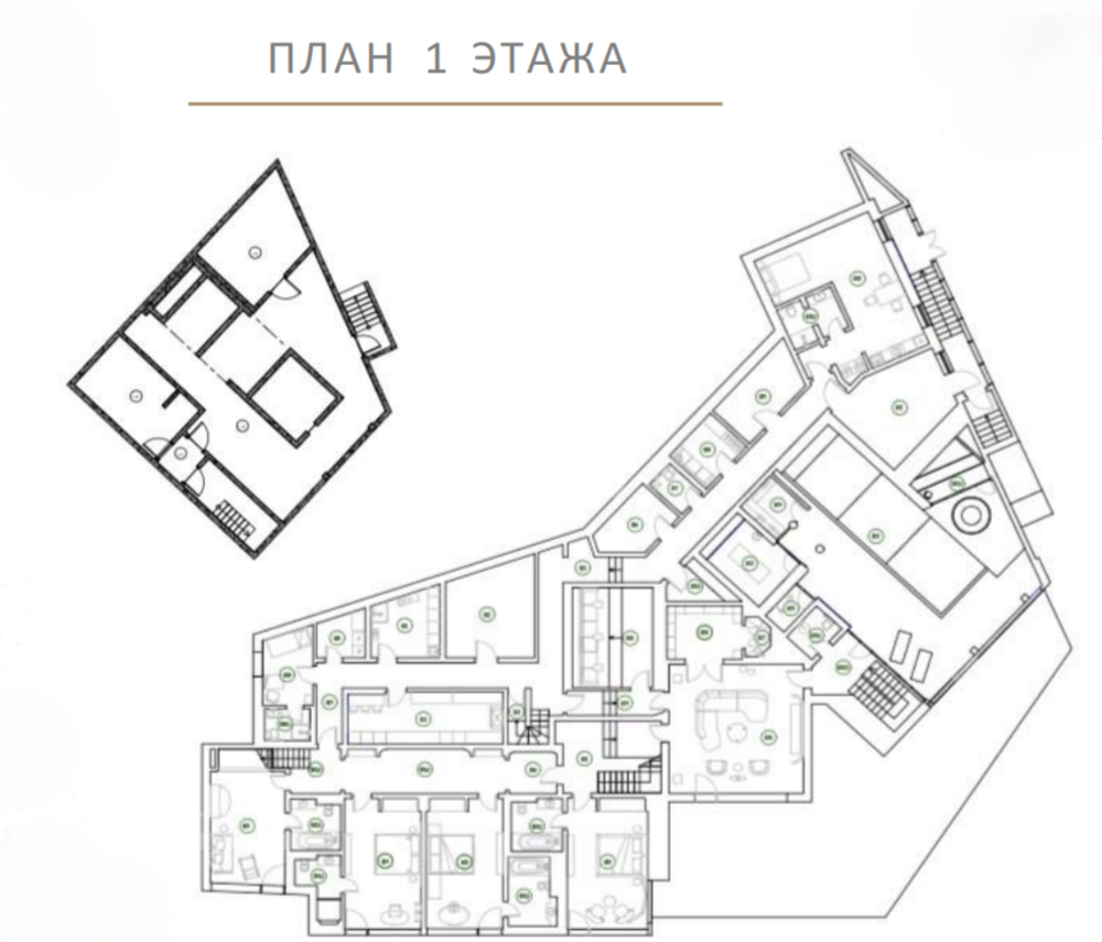 Малая гостиная, винная комната с круглосуточным охлаждением, сырная комната, домашний кинотеатр( со звукоизоляцией и акустической подготовкой, готовый к установке оборудования), блок из 4 детских спален( с индивидуальными ванными комнатами и гардеробами), производственная кухня с кухонным подъемником, кладовая, постирочная и помещение для хранения уборочного инвентаря, две спальни для персонала с душевыми, вент камера, электрощитовая, серверная, водомерный узел с оборудованием для водоподготовки, котельная, комната для водителя с санузлом.