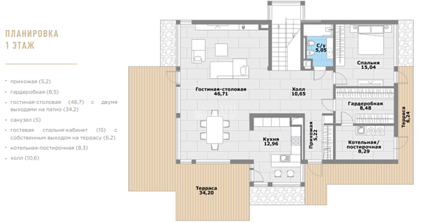 1-й этаж: чемоданная, венткамера, техническое помещение СПА-зоны.