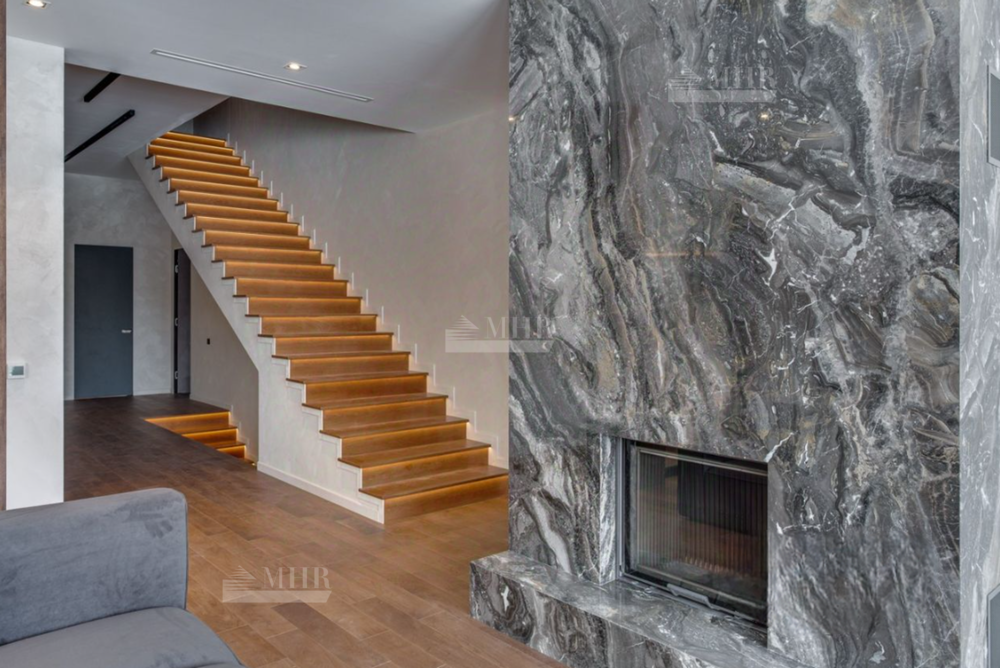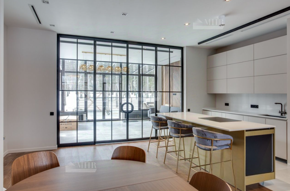 1 этаж: кухня-столовая с выходом через зимний сад на террасу, гостиная с камином, кабинет, кинозал, детская игровая.
