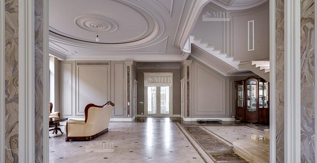 для 3-х автомобилей. Монолитно-кирпичный дом прочный и долговечный. Фасад облицован натуральным камнем и ракушечным песчаником. Цоколь - из индийского гранита. На крыше уложена натуральная немецкая черепица. По периметру дома уложен итальянский гранит. В доме выполнен превосходный дизайнерский ремонт с применением высококачественных материалов. Роскошный интерьер в классическом стиле исполнен в спокойных тонах, дополнен изысканной мебелью и бытовой техникой. Мебель для кухни и гостиной бренда "Diamante" привезена из Италии.