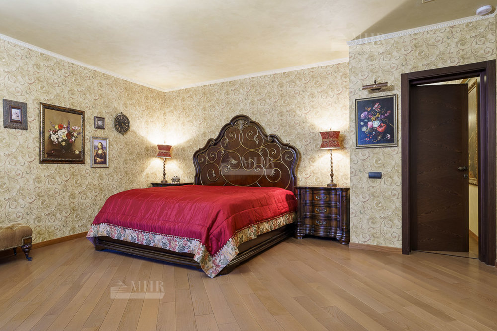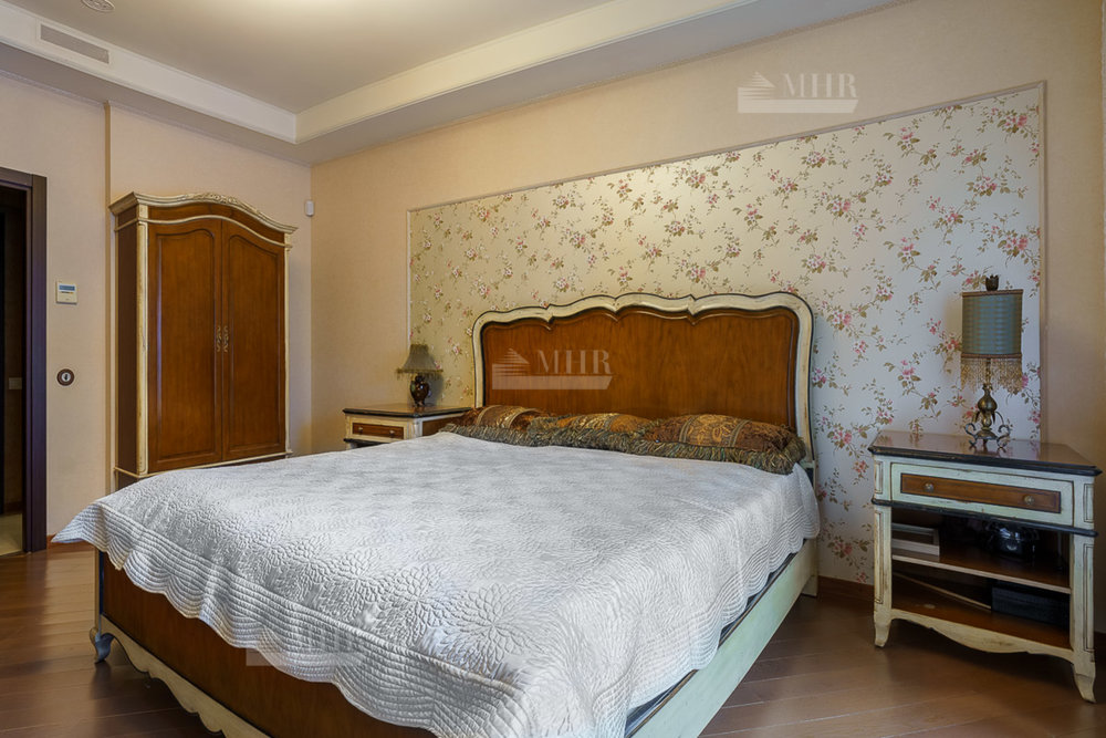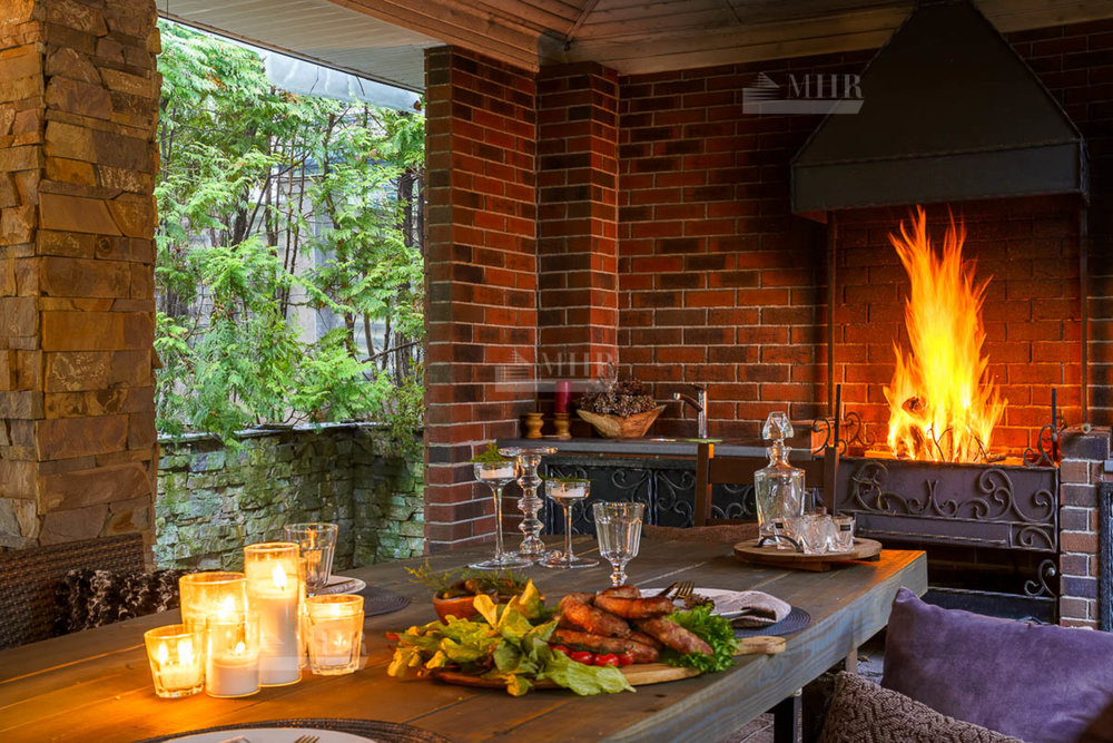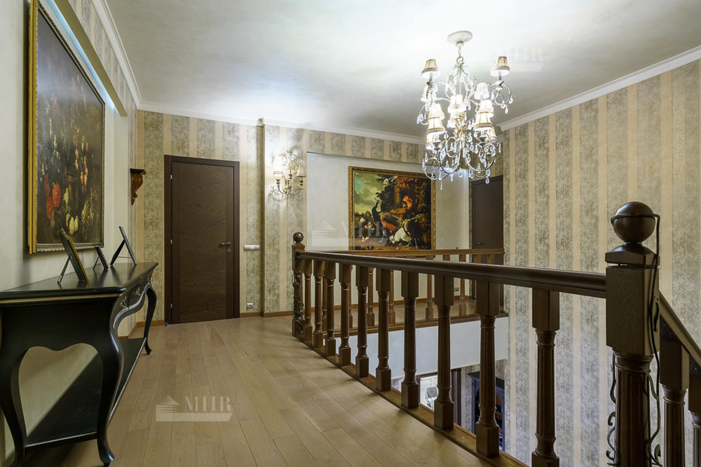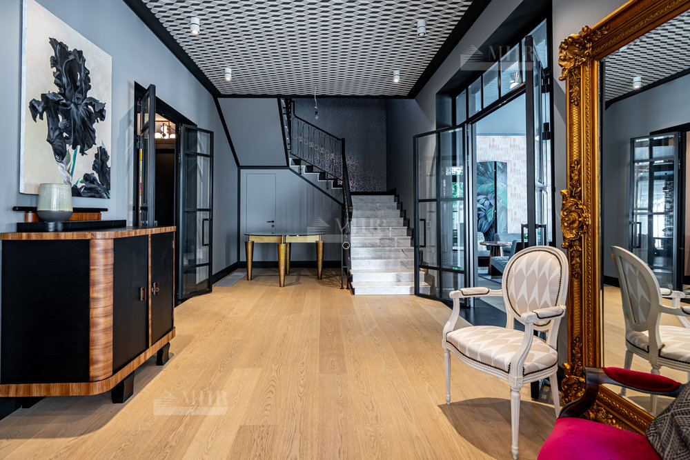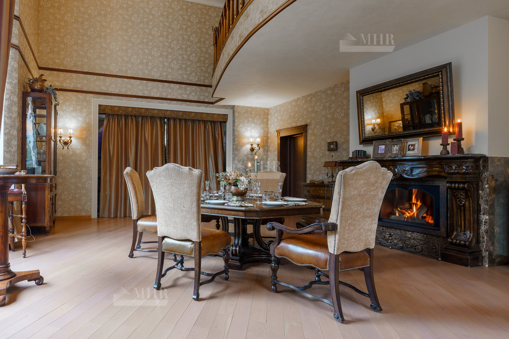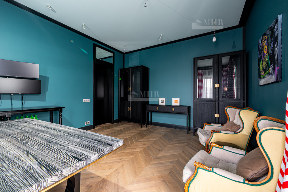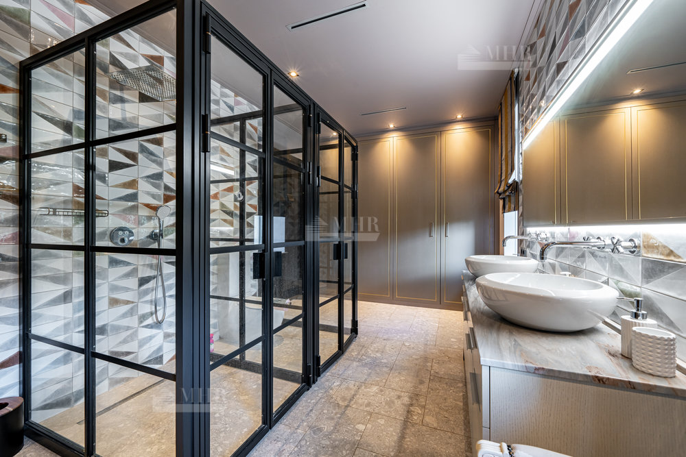 2-й уровень: просторная главная спальня с камином, террасой, гардеробной и санузлом, гостиная-библиотека, детская гостиная, две детских комнаты, вместительные шкафы и санузел.SPA: зона с бассейном и выходом на террасу, сауна, хамам, гостиная с камином для отдыха, две гостевые спальни со своими санузлами.