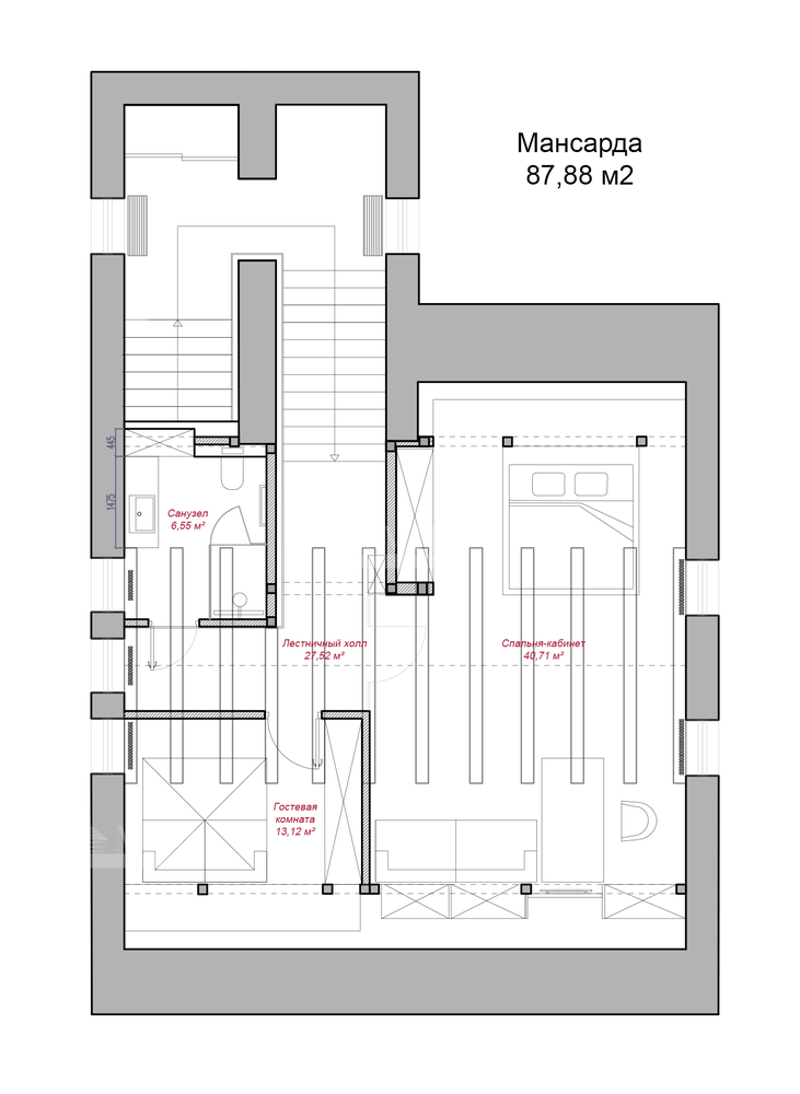 3-й этаж: холл, спальня-кабинет, гостевая комната.