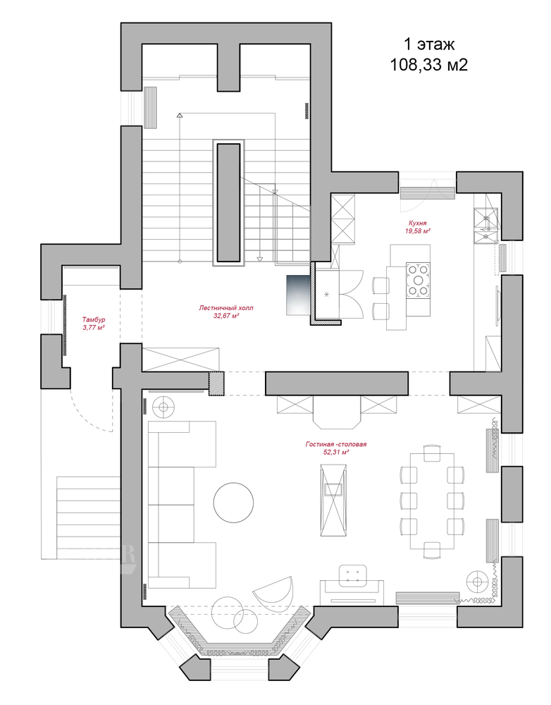 1-й этаж: прихожая, холл, кухня, гостиная-столовая, терраса;