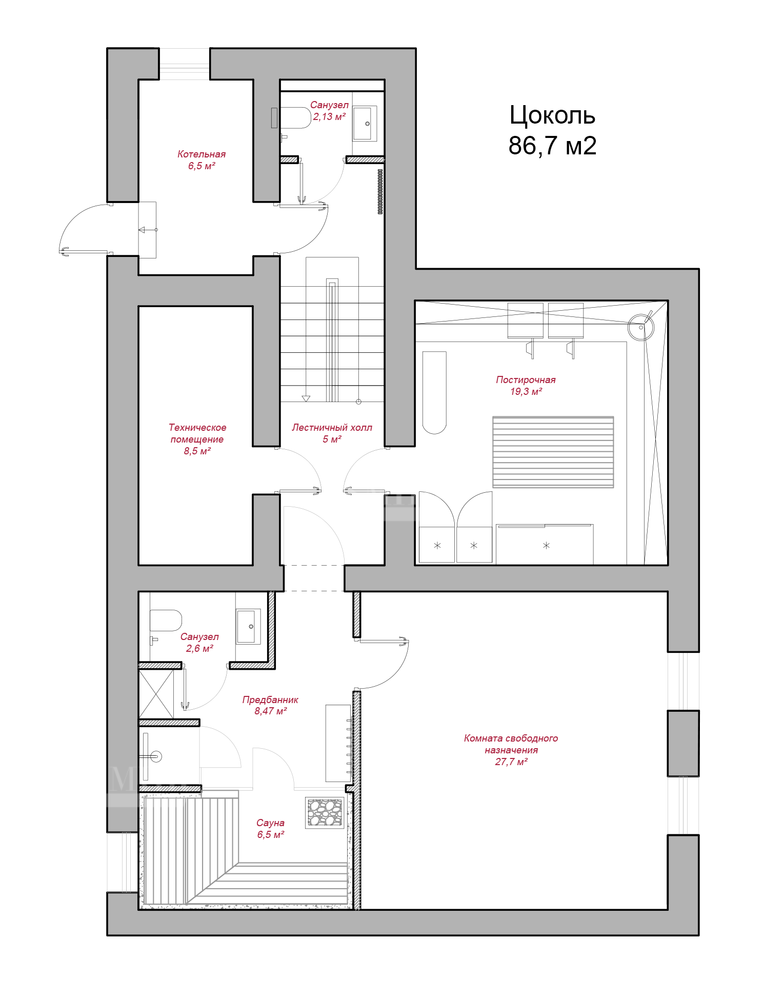 Цоколь: котельная, тех. помещение, с/у, постирочная, сауна, комната свободного назначения