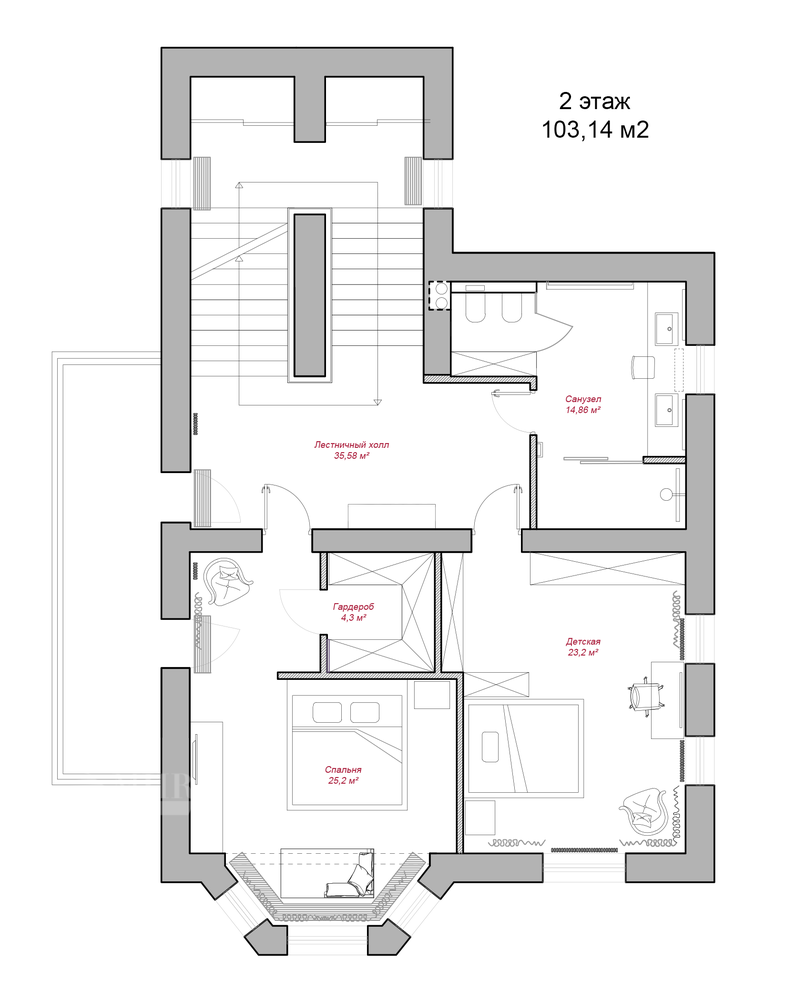 2-й этаж: холл, большой с/у, спальня с гардеробной, спальня-детская;