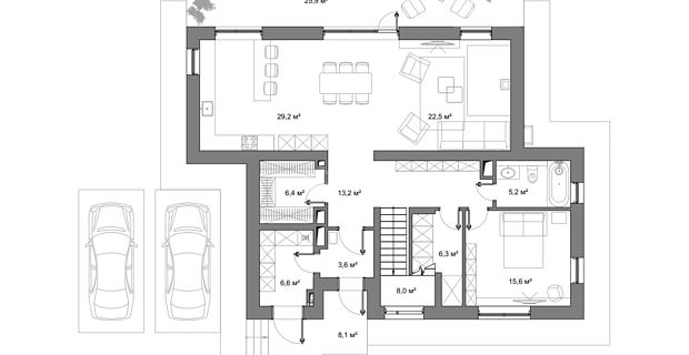 1й этаж: холл, с/у, кухня-столовая-гостиный зал с камином, спальня, СПА-зона: бассейн 8 м, сауна, душевая, гараж на 2 м/м с квартирой для персонала над ним, котельная;