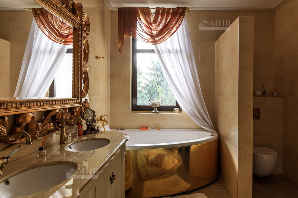 На участке 22 сотки расположены   просторный основной дом с панорамным остеклением площадью 455 кв м и гостевой дом со СПА-зоной площадью 411 кв м. При строительстве использовались только качественные строительные материалы. Строго охраняемый камерный поселок  расположен в непосредственной близости от Москвы-реки, в самом сердце Рублевки.