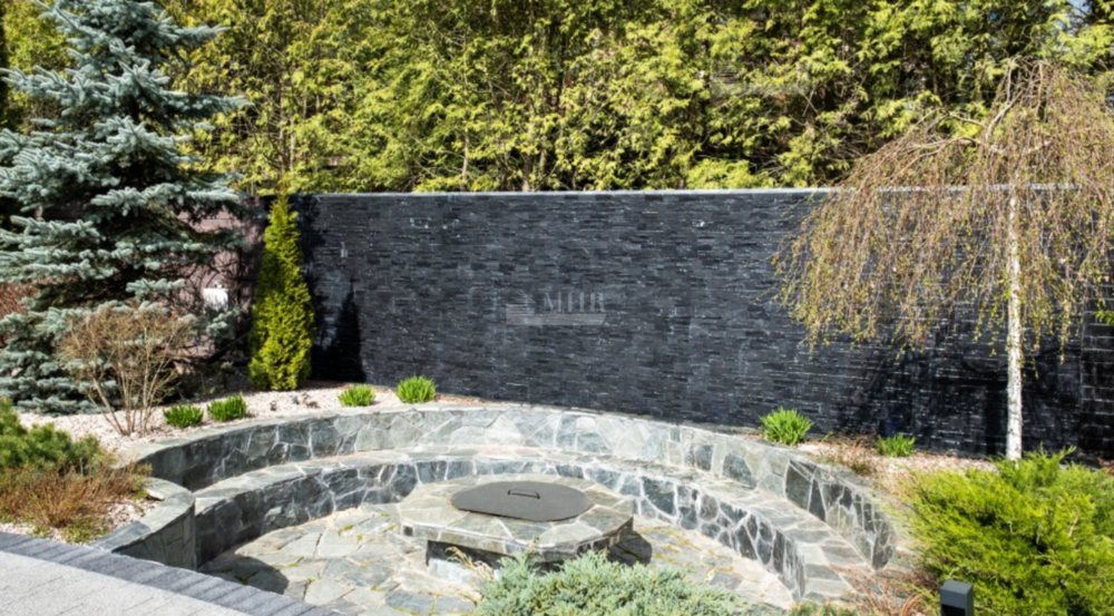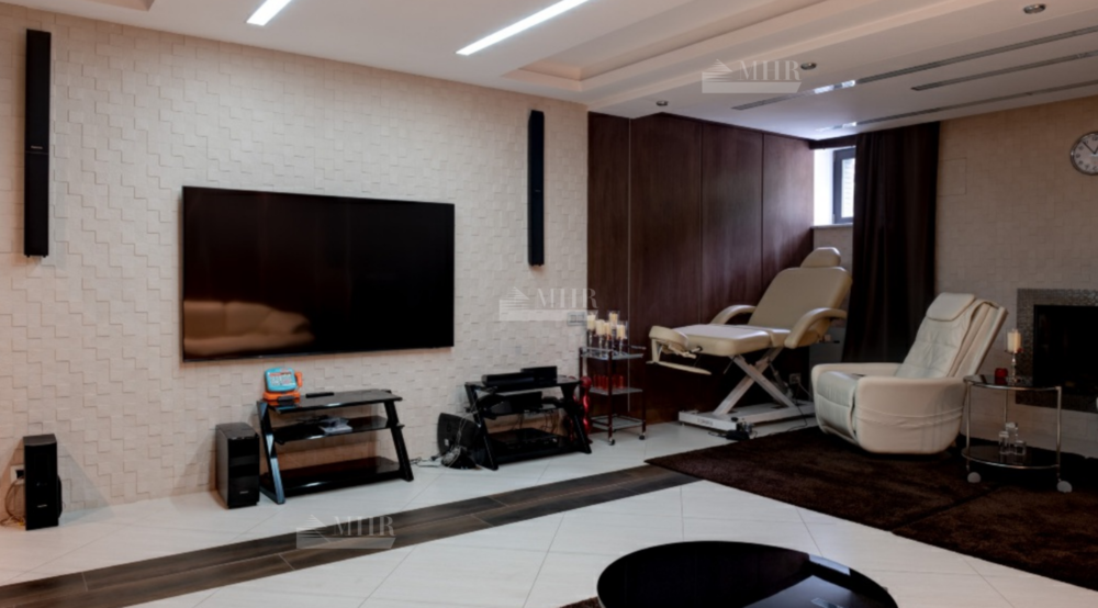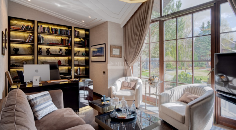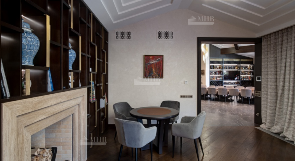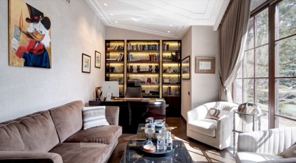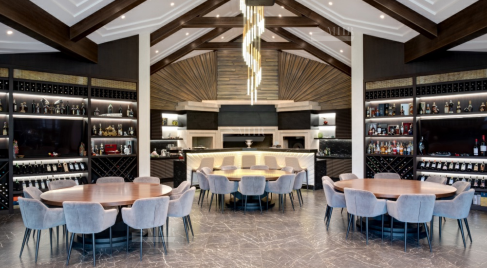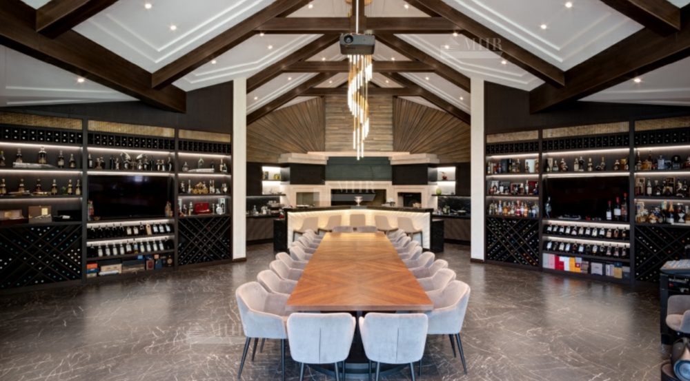 креслами и кинозалом. Из основного дома можно перейти в дом-шале, где расположены гостиная, кабинет, большая профессиональная кухня-барбекю с залом для гостей. На участке также находится дом для персонала.