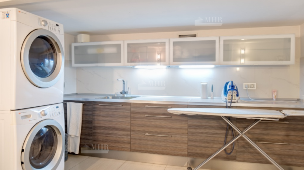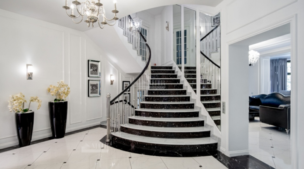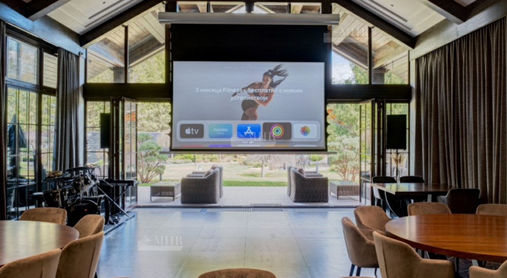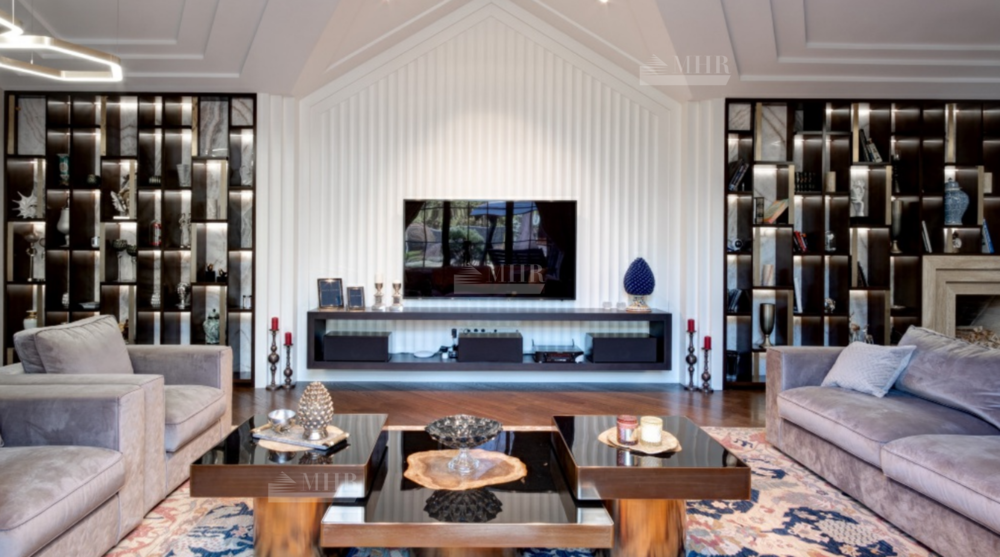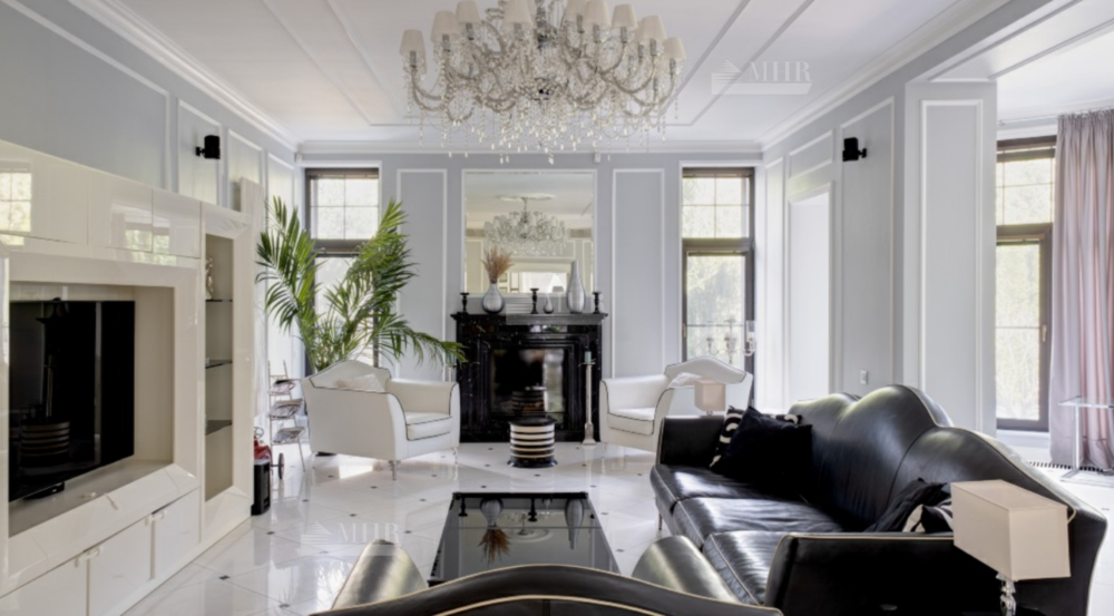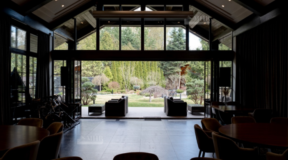 креслами и кинозалом. Из основного дома можно перейти в дом-шале, где расположены гостиная, кабинет, большая профессиональная кухня-барбекю с залом для гостей. На участке также находится дом для персонала.