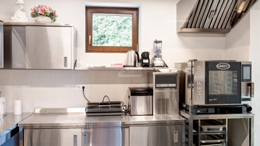 В доме шале расположены: большая гостиная с камином, холодильная комната, мангальная зона, с разнообразными видами печей, кабинет, с/у, подсобные помещения, переход в дом для персонала.