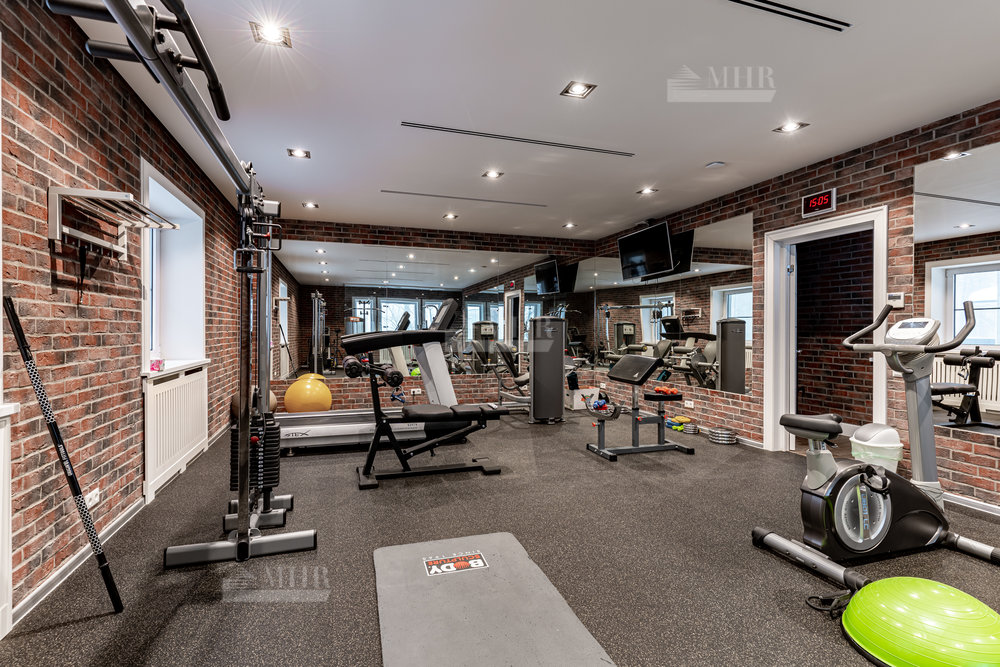 2й этаж: кабинет, спальня с гардеробной и санузлом (3 шт.), спальня с санузлом (2 шт.), балкон (2 шт.), блок для персонала, тренажерный зал, холл.
