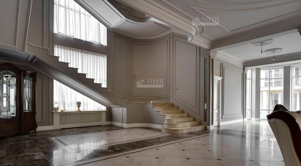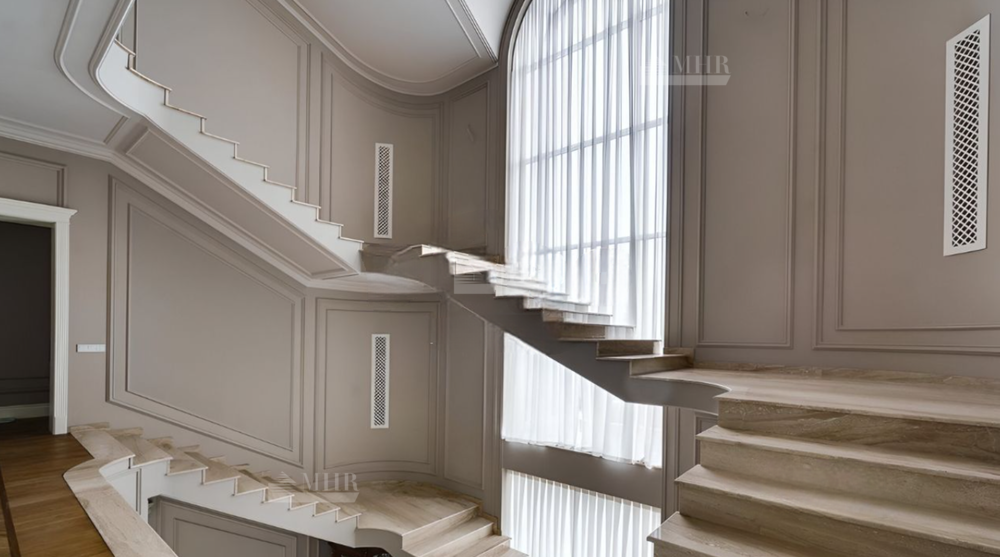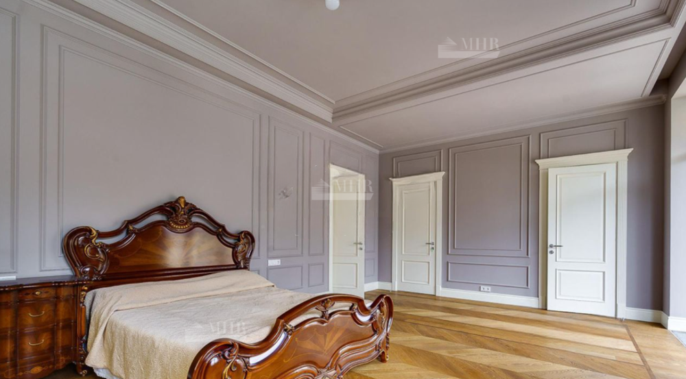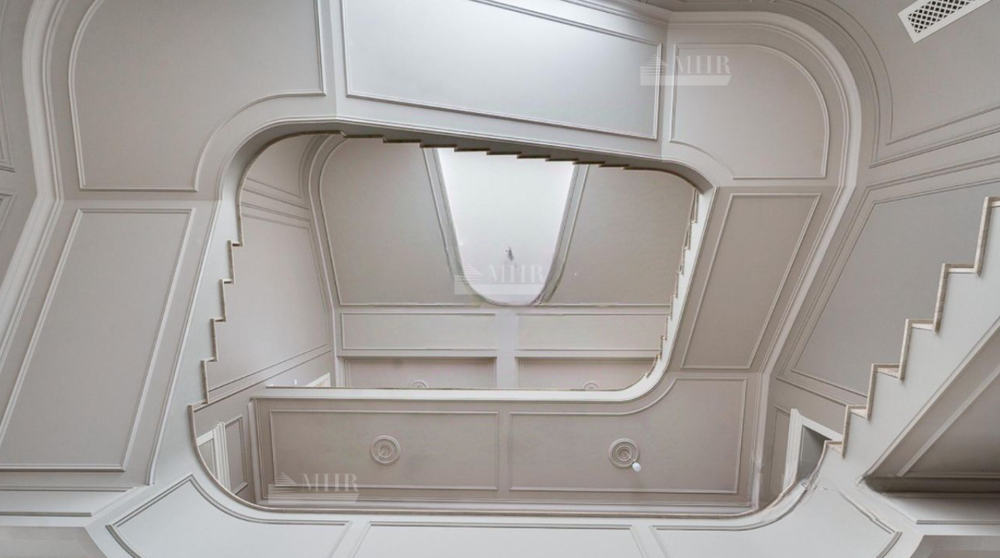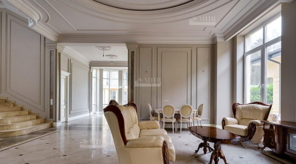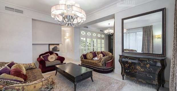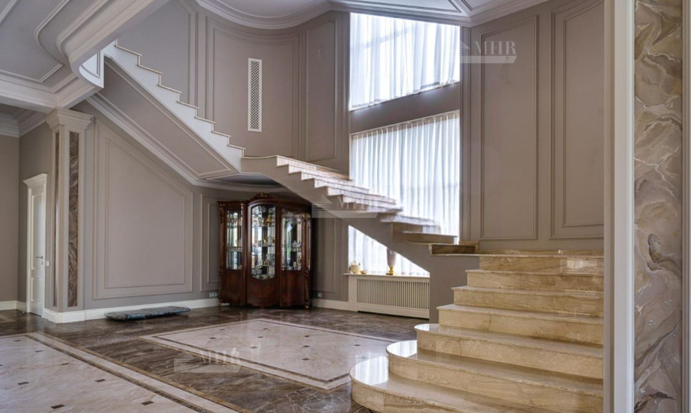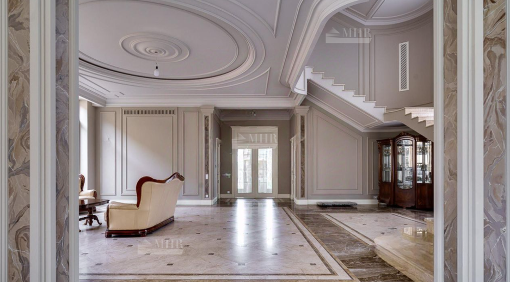 В доме предусмотрены: 5 спален, 6 с/у, гостиная, кухня, столовая, гардеробные и кинозал.