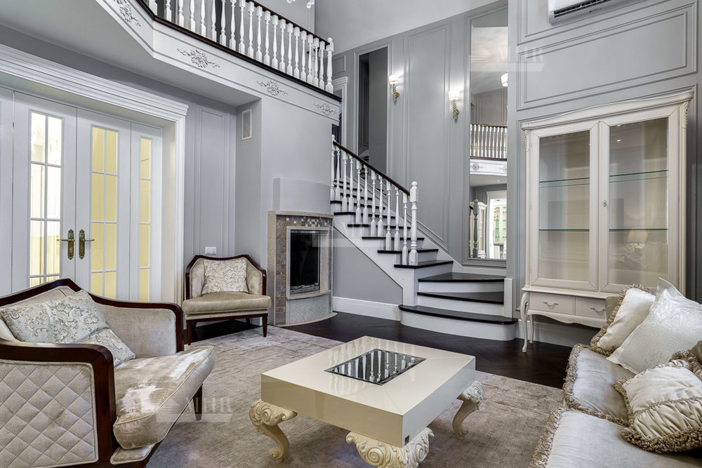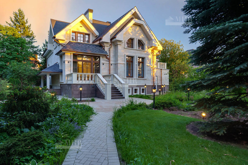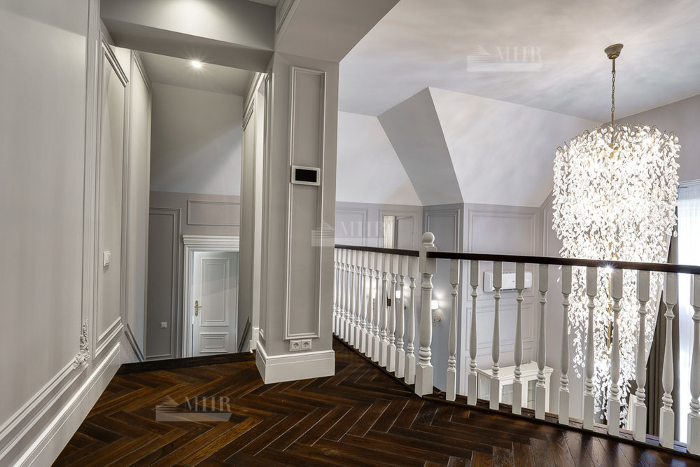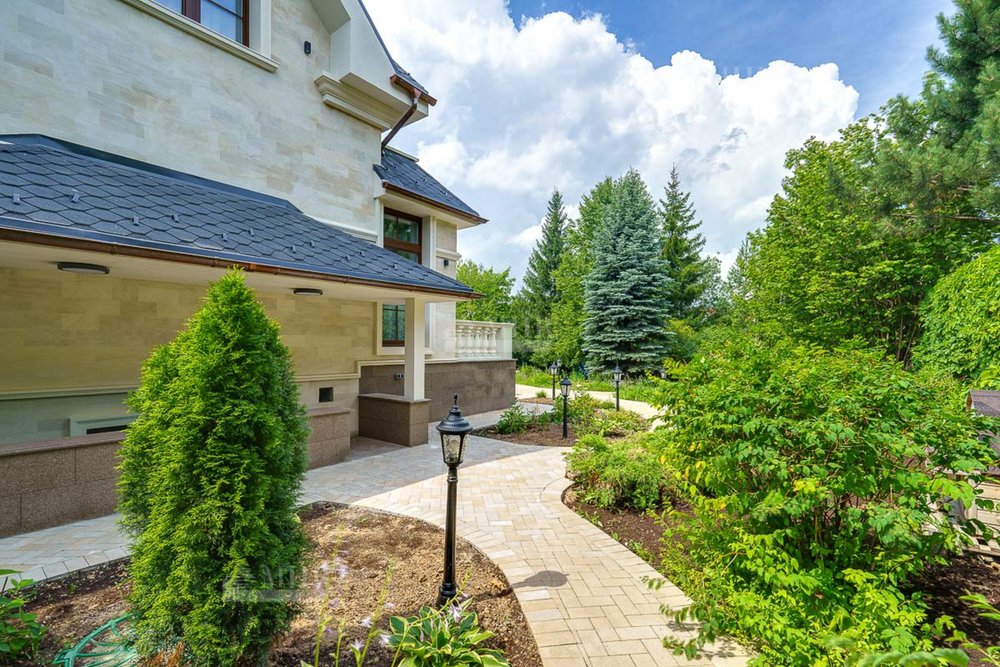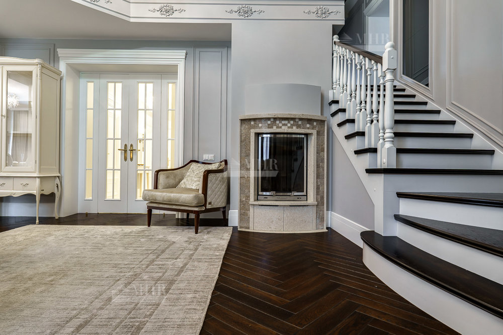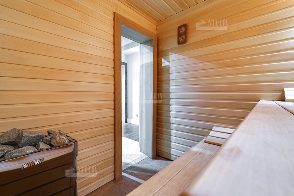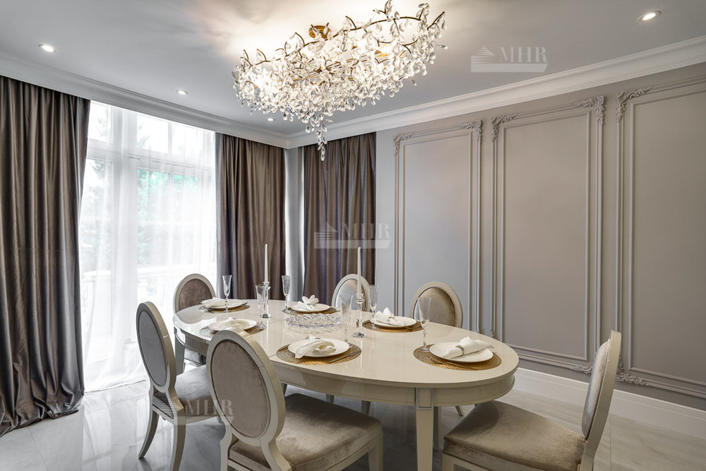 В отделке использовались высококачественные материалы - паркетная доска из натурального дуба, мрамор, фасад облицован натуральным камнем. Мебель в гостиной и зоне столовой Giorgio Casa - Италия, кухня (со встроенной Итальянской бытовой техникой SMEG), мягкая мебель выполнены на заказ. Планировка дома включает в себя: 5 спален, 4 санузла, кухню гостиную-столовую, СПА-зону с кедровой бочкой и сауной. На участке произведена посадка крупномеров, декоративных кустарников и растений.