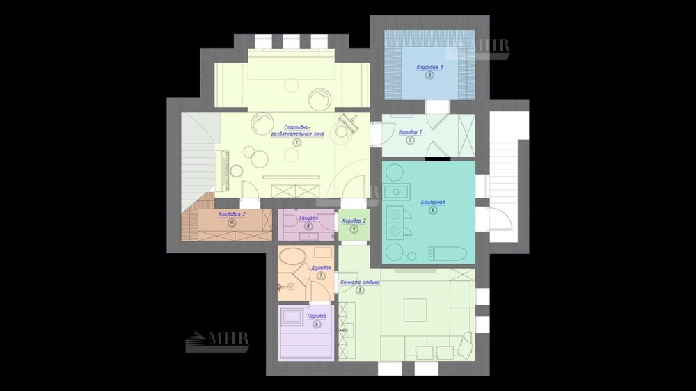 цоколь: гардеробная, кладовая, зона отдыха с сауной, с/у;