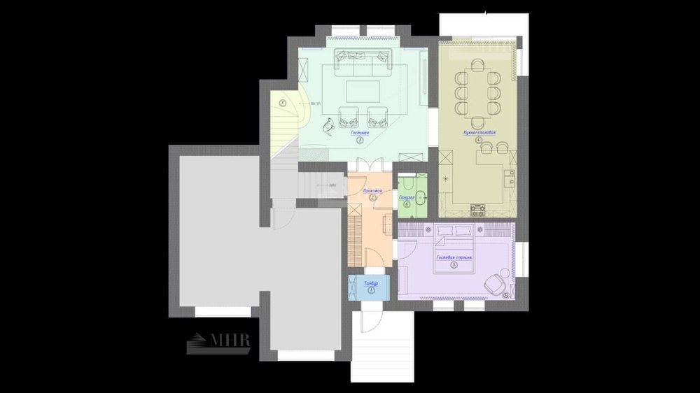 1 этаж: гостевая спальня, с/у гостевой, гардероб, гостиная, столовая, кухня, выход на террасу;