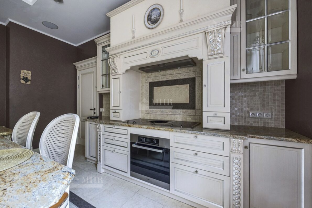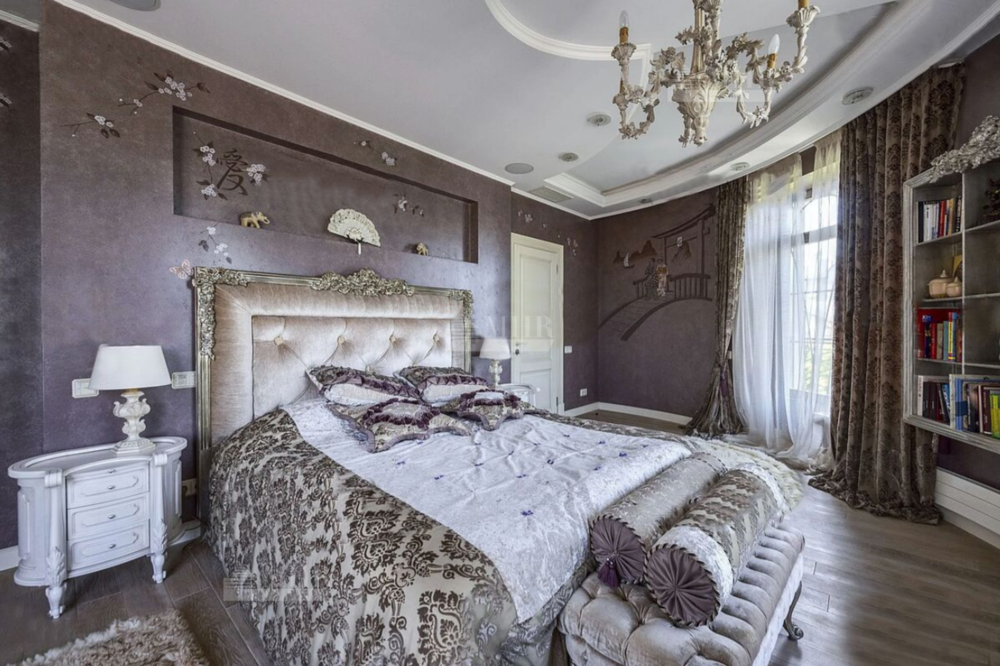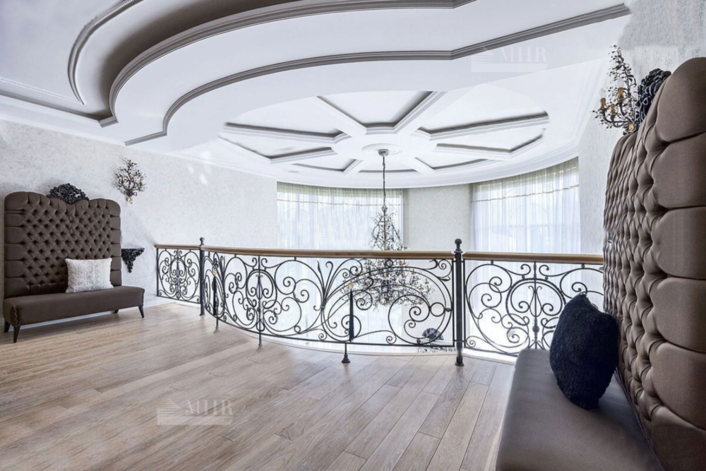 В планировке предусмотрено 3 спальни с ванными и гардеробными комнатами, сауна, домашний кинотеатр, кабинет, просторная гостиная со вторым светом и камином, кухня, столовая, открытая терраса с зоной барбекю.