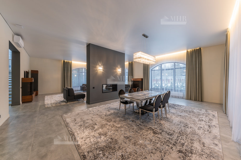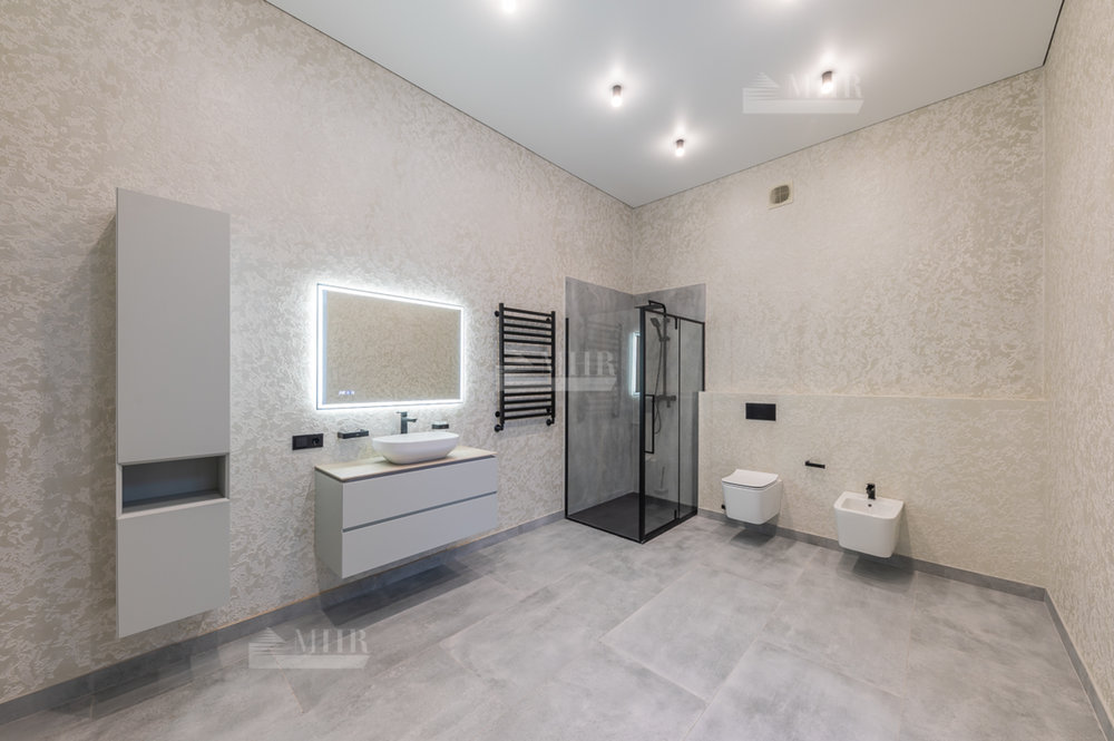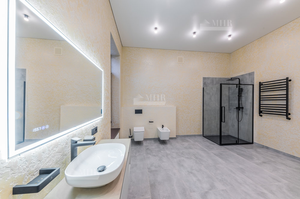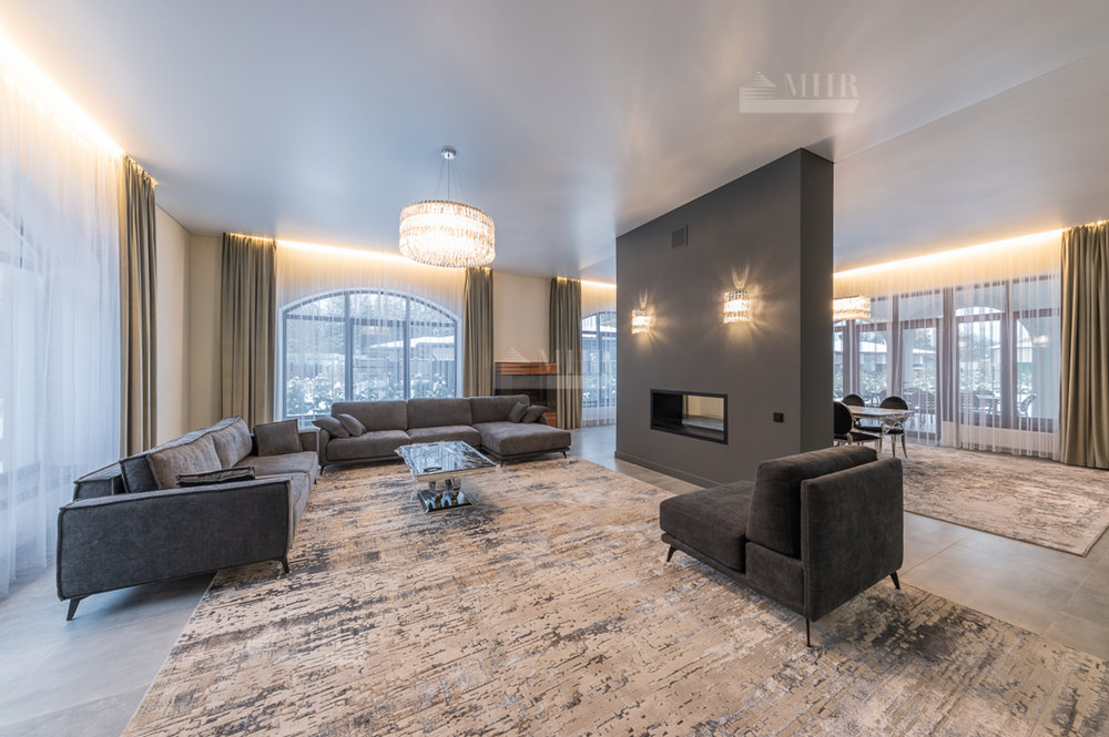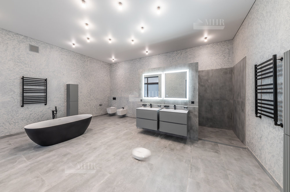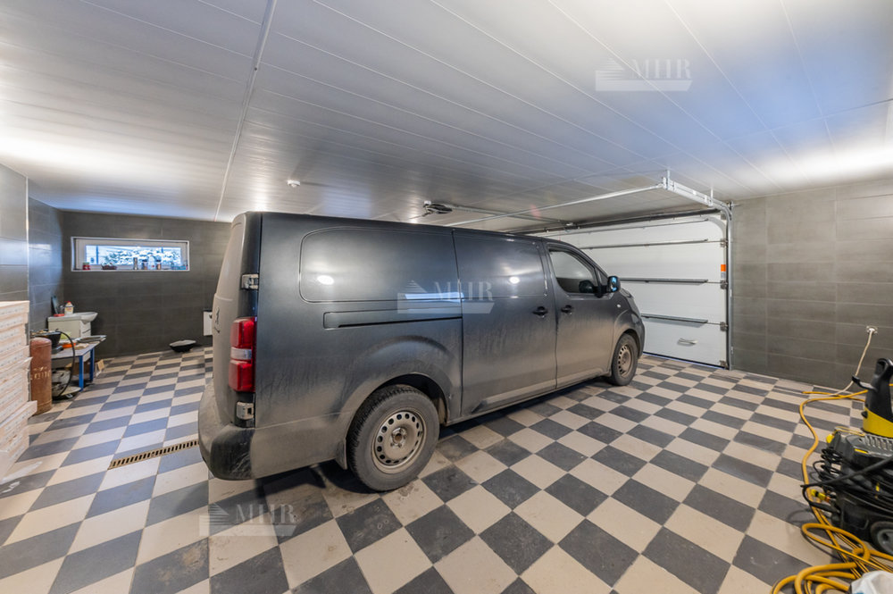 Газон с автополивом и специальным резервуаром для воды, ландшафтные работы. Деревья и кусты, клинкерная плитка, ливневки, дренажи и стоки с подогревом. Два котла Viesmann с турбогорелками, везде водяные теплые полы, нагреватели стоков и кровли, канальное кондиционирование, водоочистка, притяжная вентиляция нового типа, авто-мойка в гараже с системой очистки. Внутри дом отштукатурен, фасад сделан.