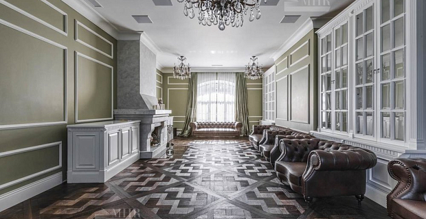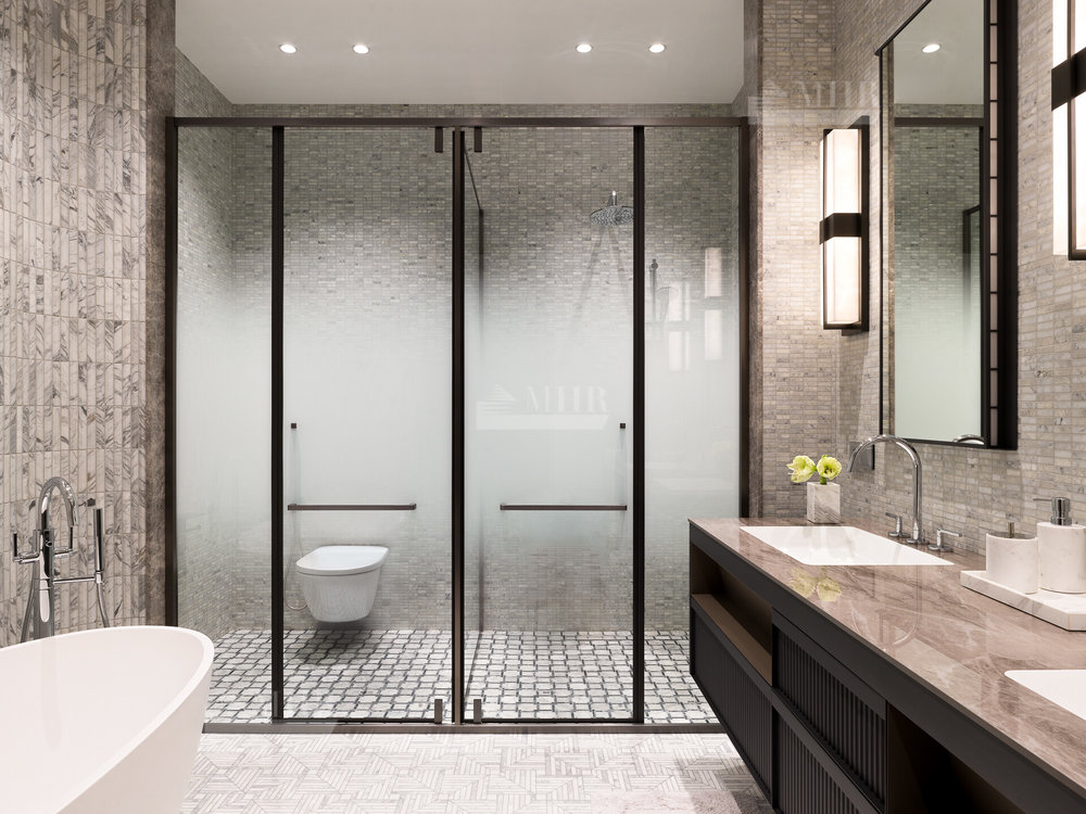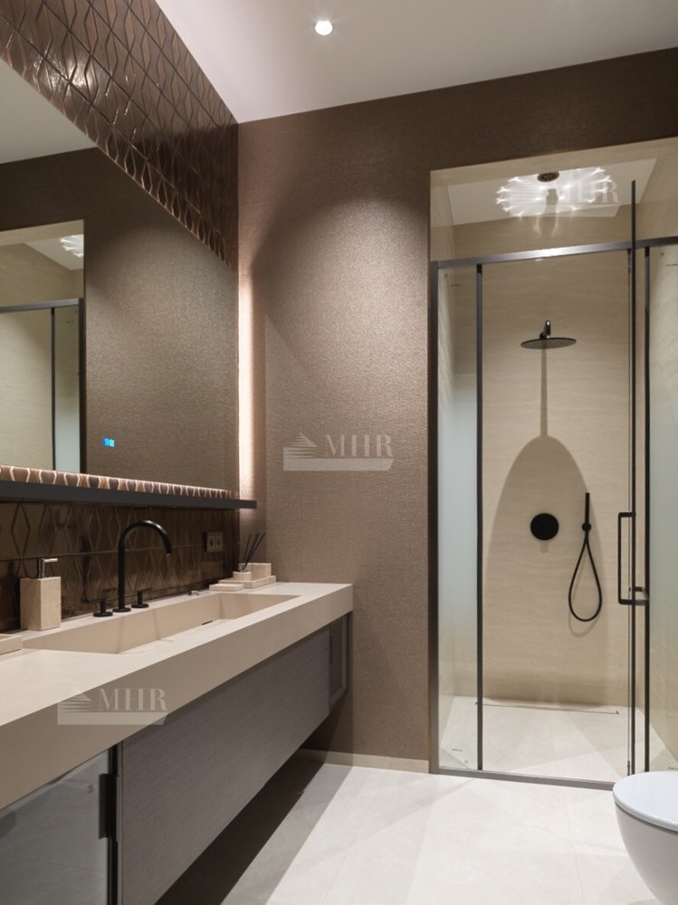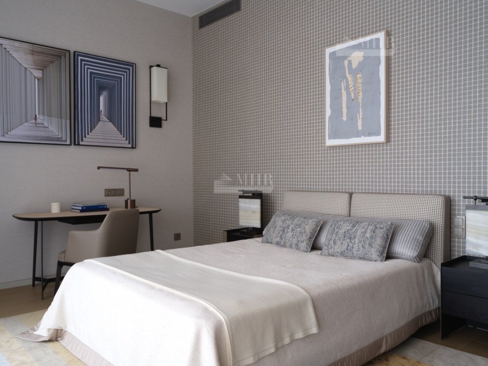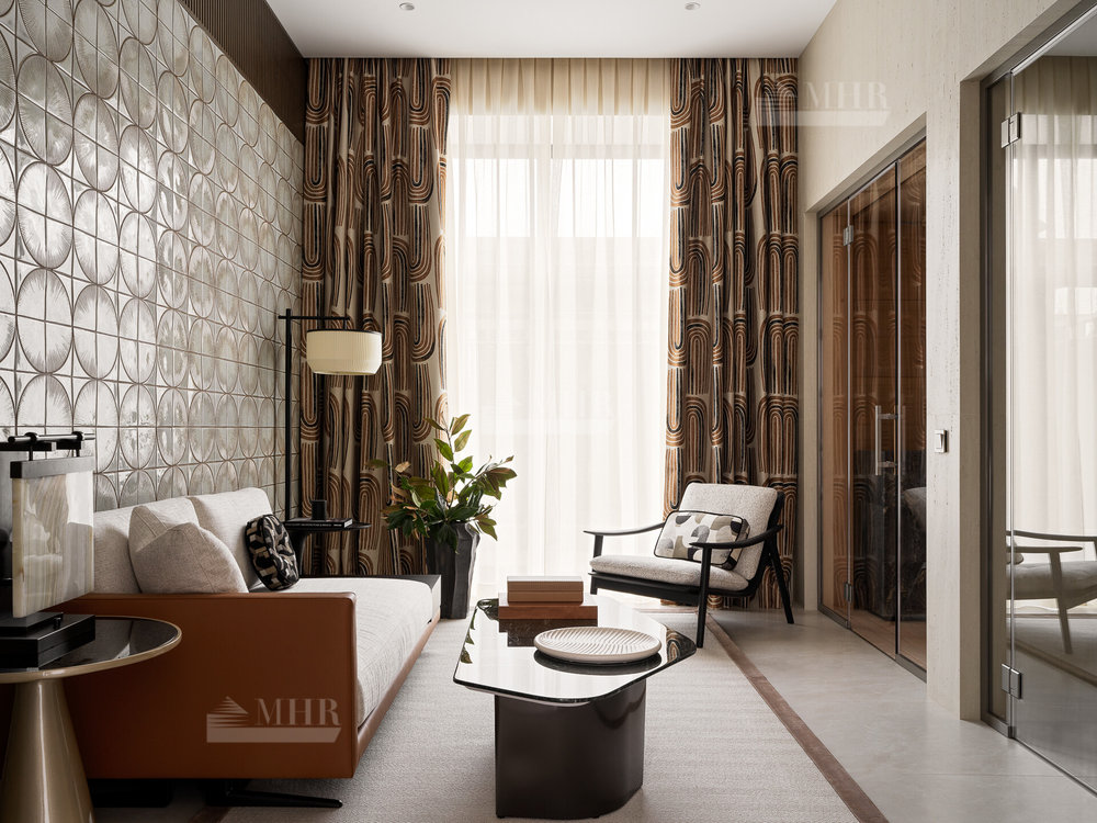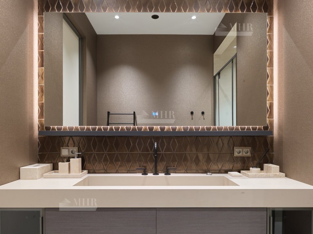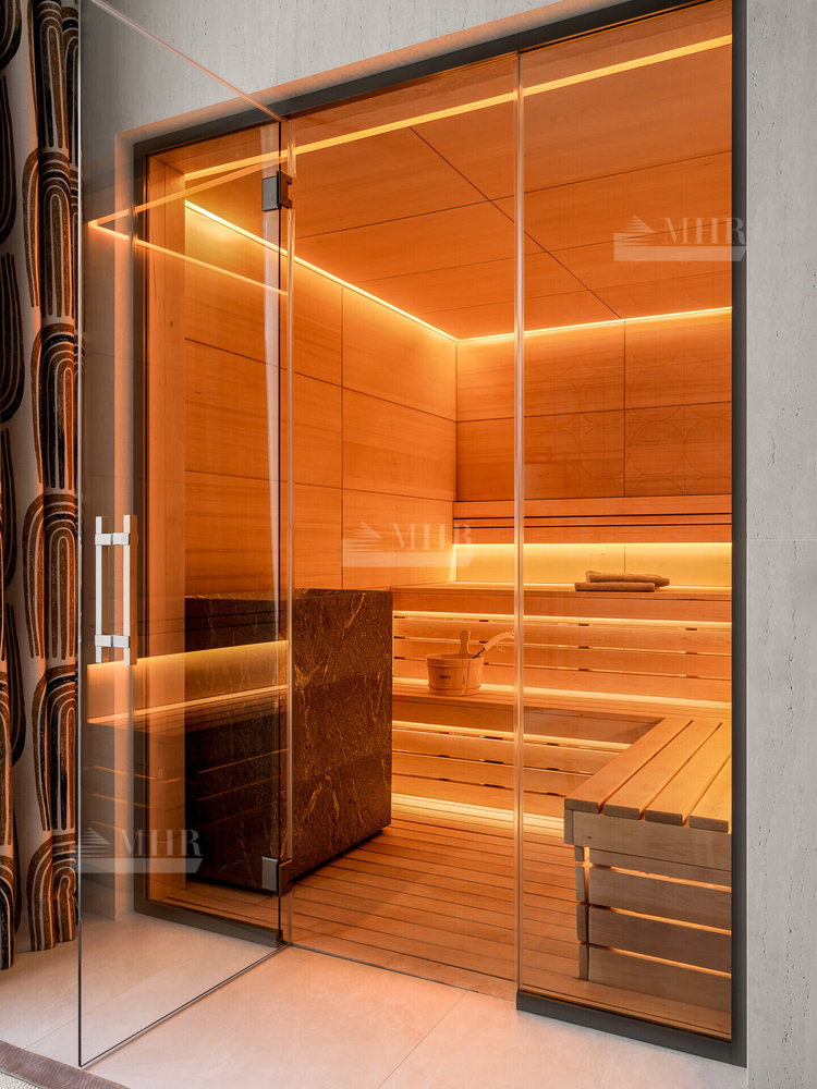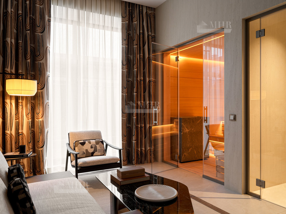 В отделке только премиальные материалы: мраморная мозаика, текстильные обои, ковры ручной работы, уникальное освещение из оникса и алебастра.