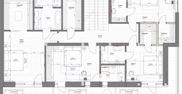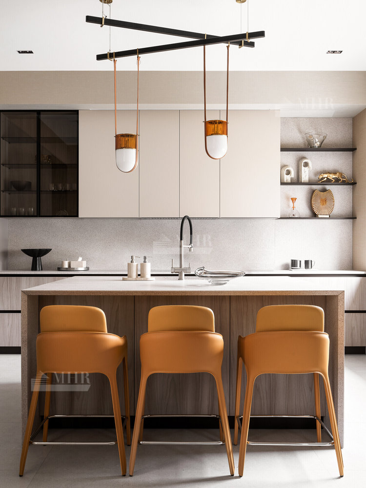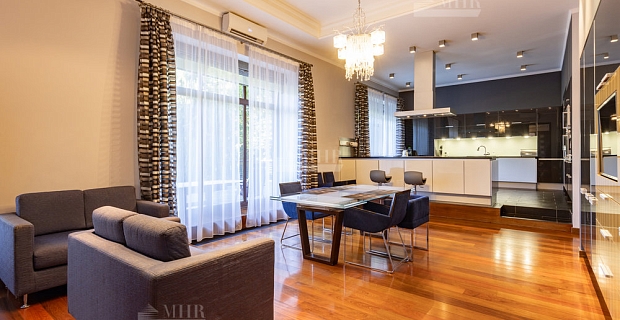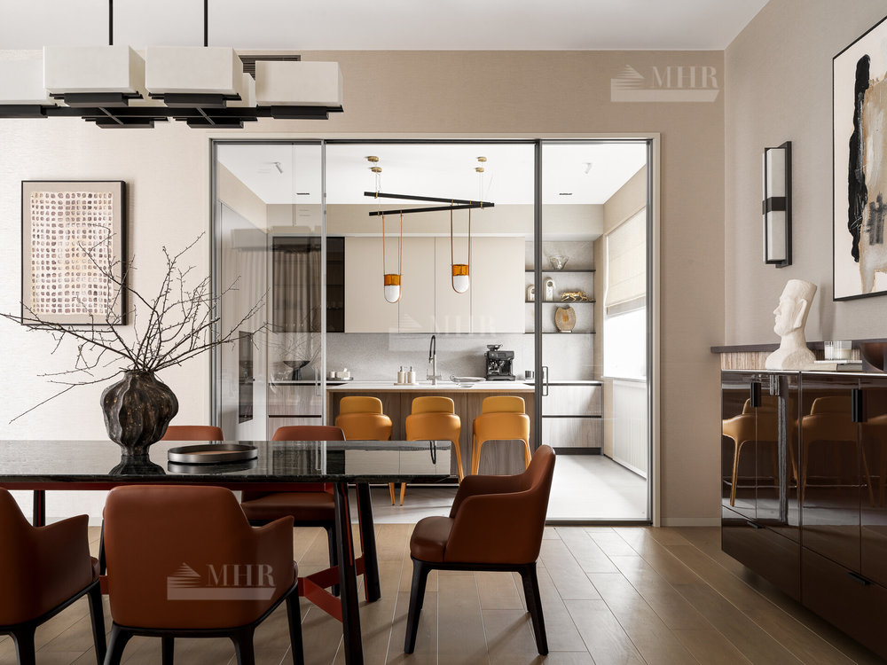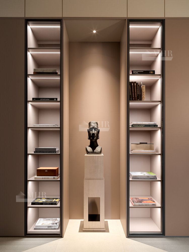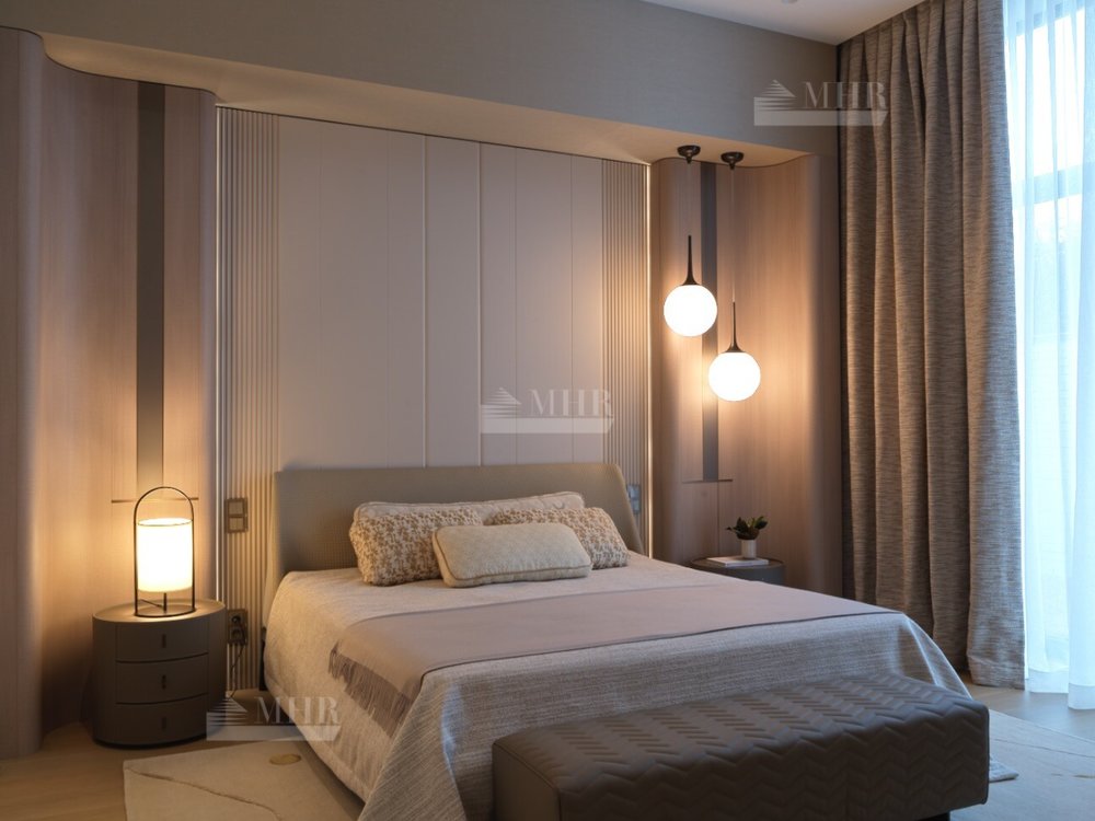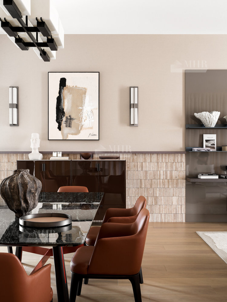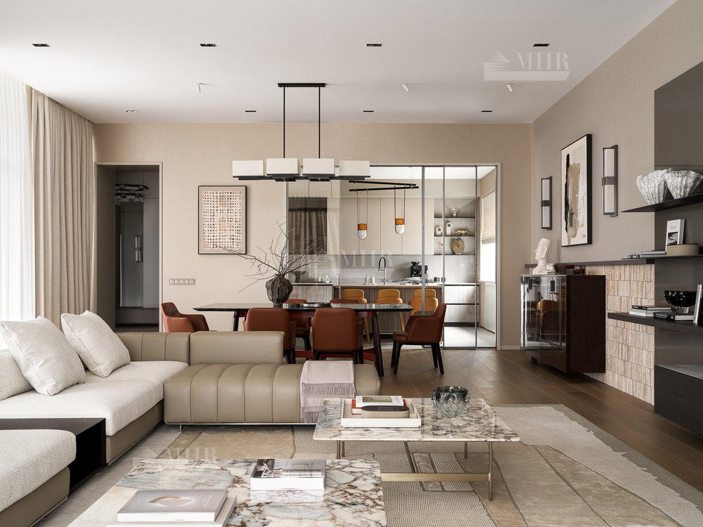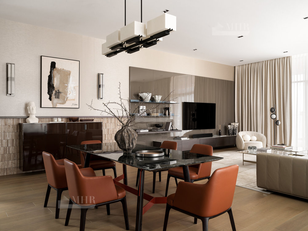 В отделке только премиальные материалы: мраморная мозаика, текстильные обои, ковры ручной работы, уникальное освещение из оникса и алебастра.
