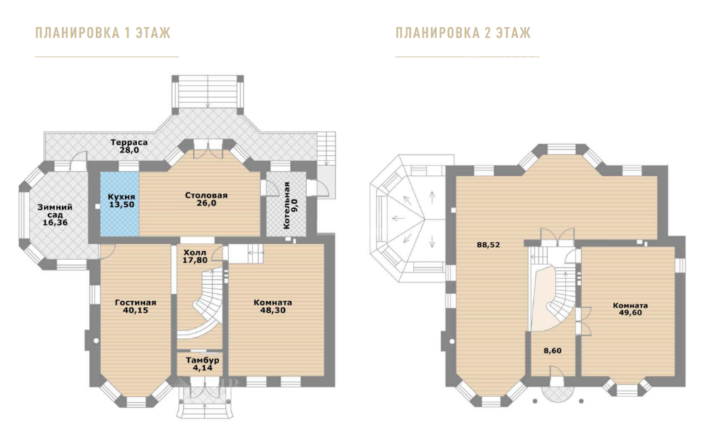 1-й этаж: террасса, холл, тамбур, котельная, кухня, зимний сад, комната, гостиная;