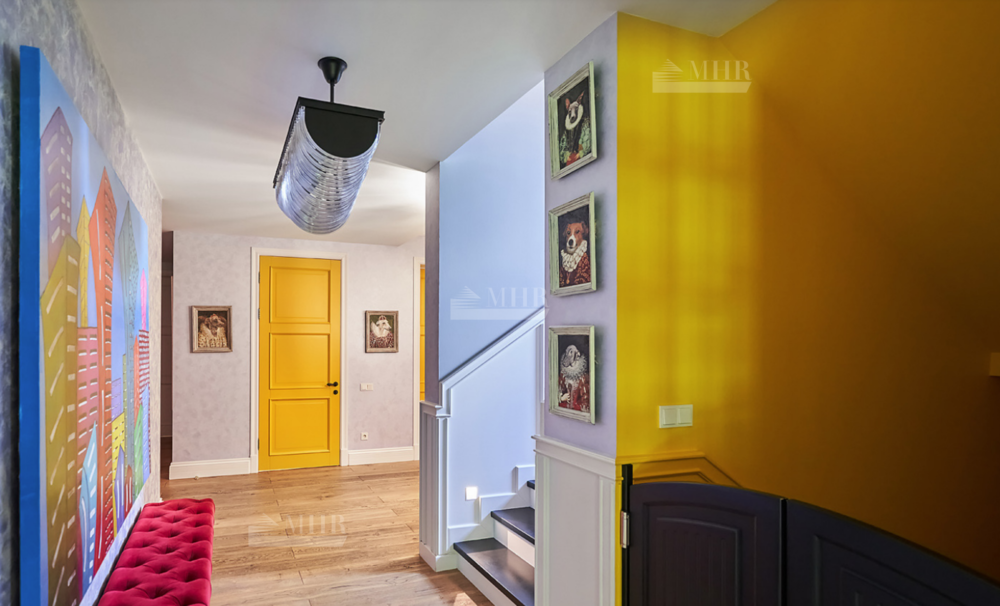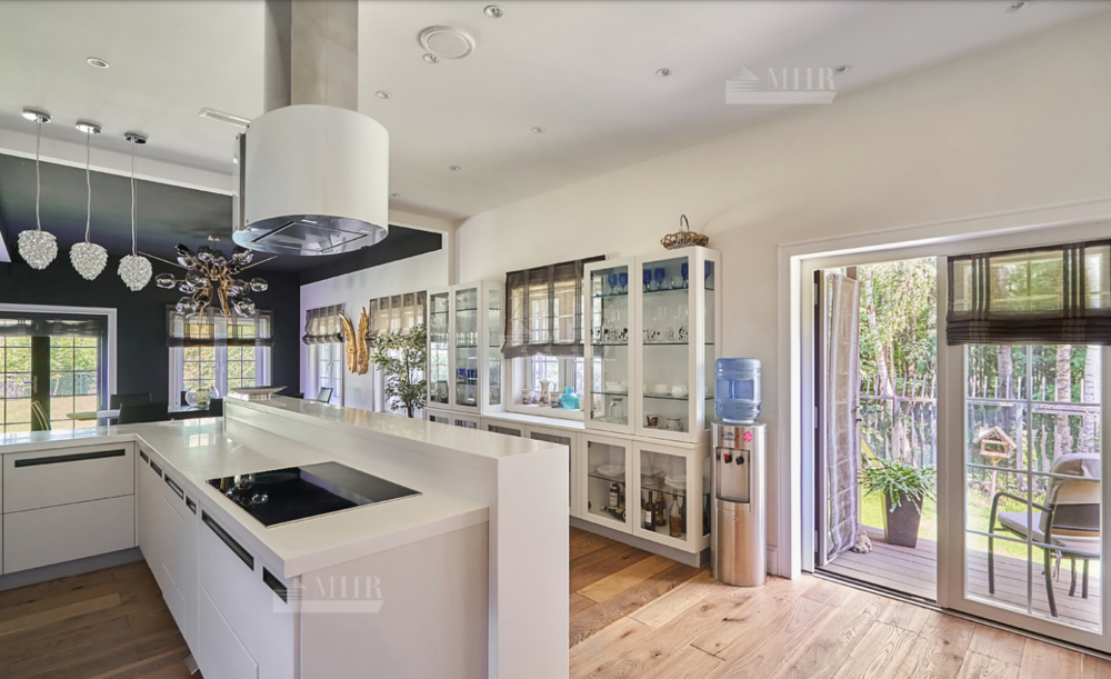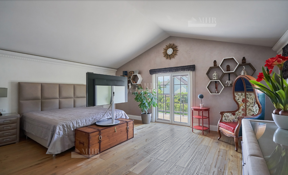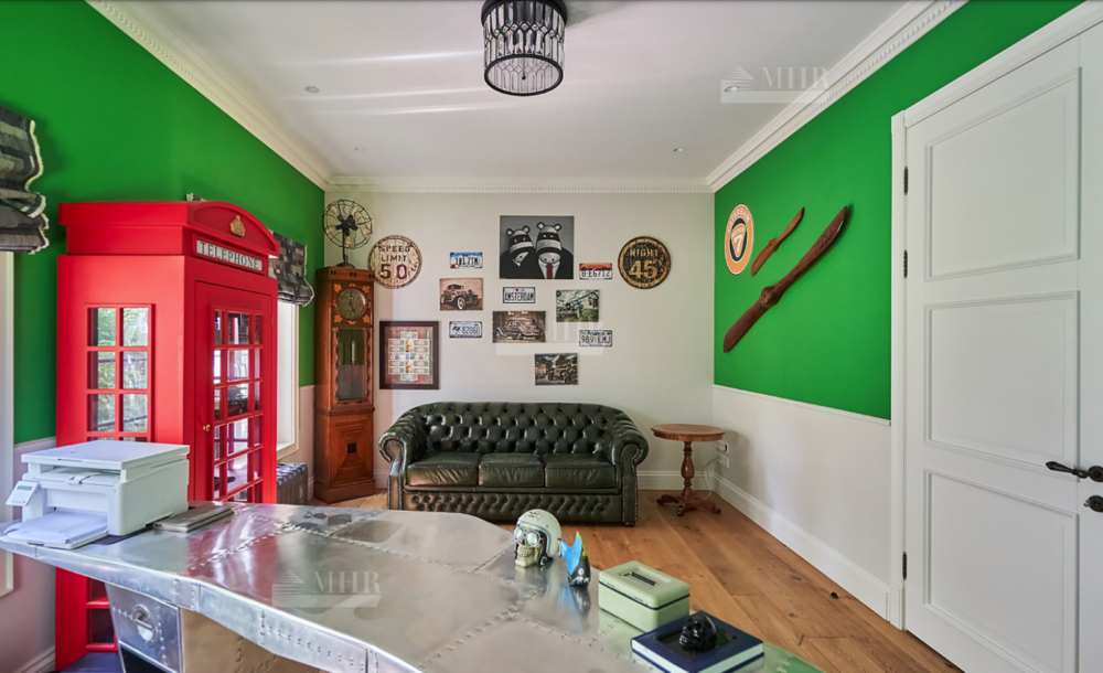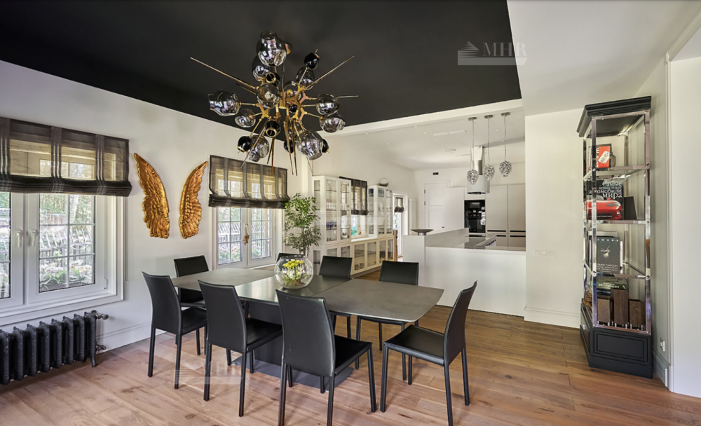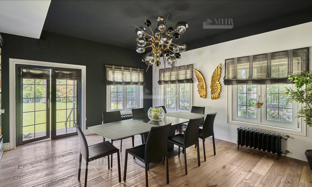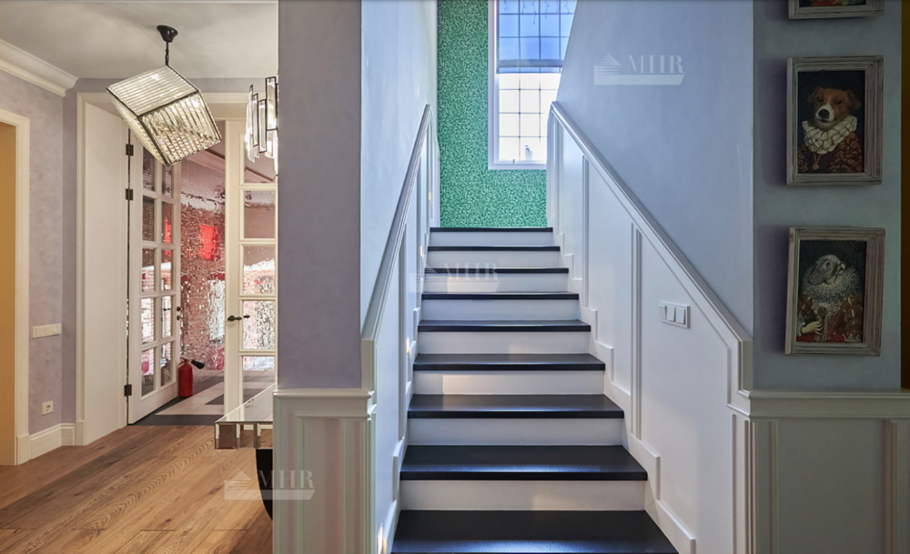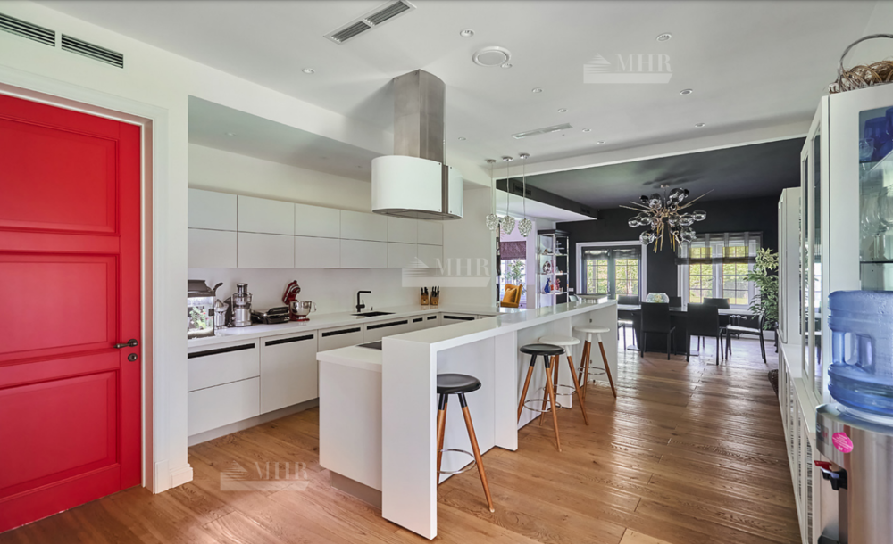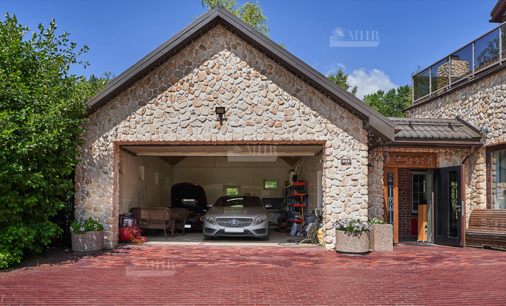 Внешний фасад дома - смесь американской и английской классики, большой гараж на 4 автомобиля, просторная территория. Функциональная планировка - гардеробные комнаты, 5 спален, большая входная группа, оформленная прозрачной смальтой. Сауна с зоной отдыха заслуживают отдельного внимания.
