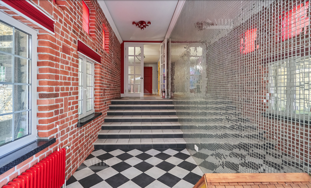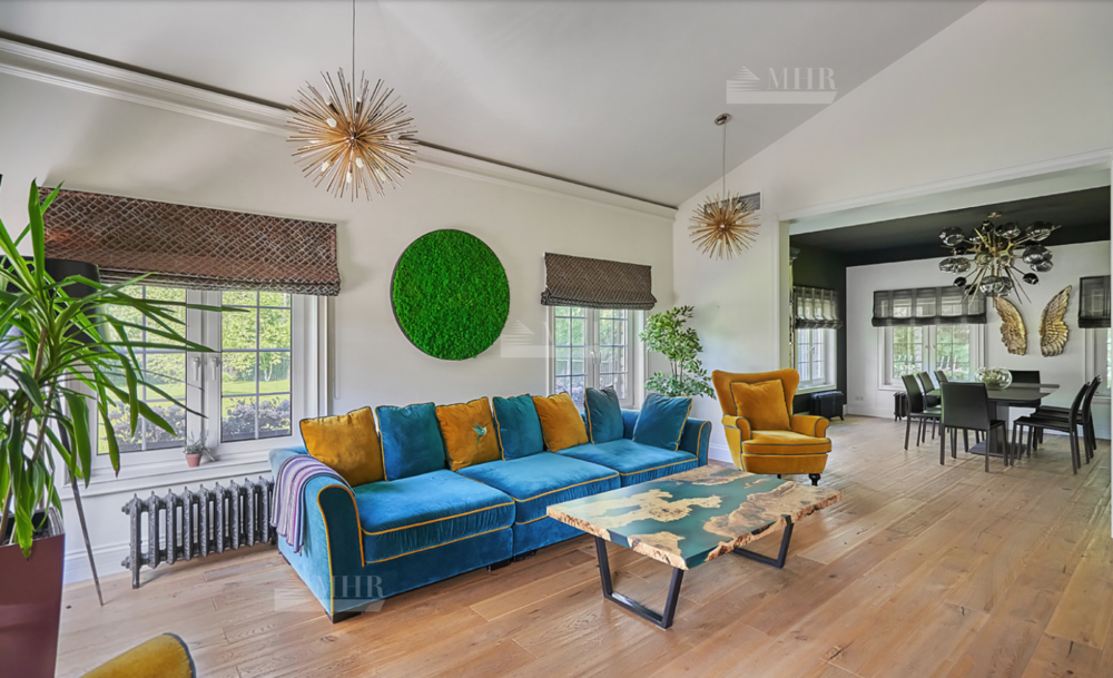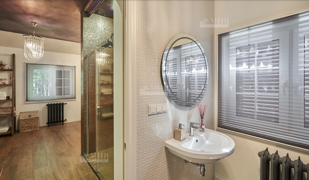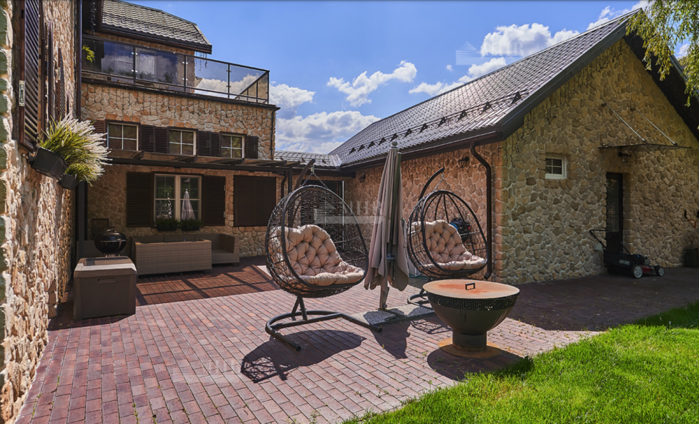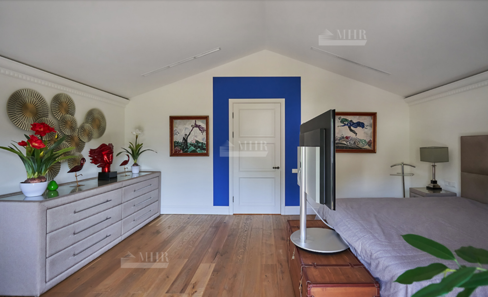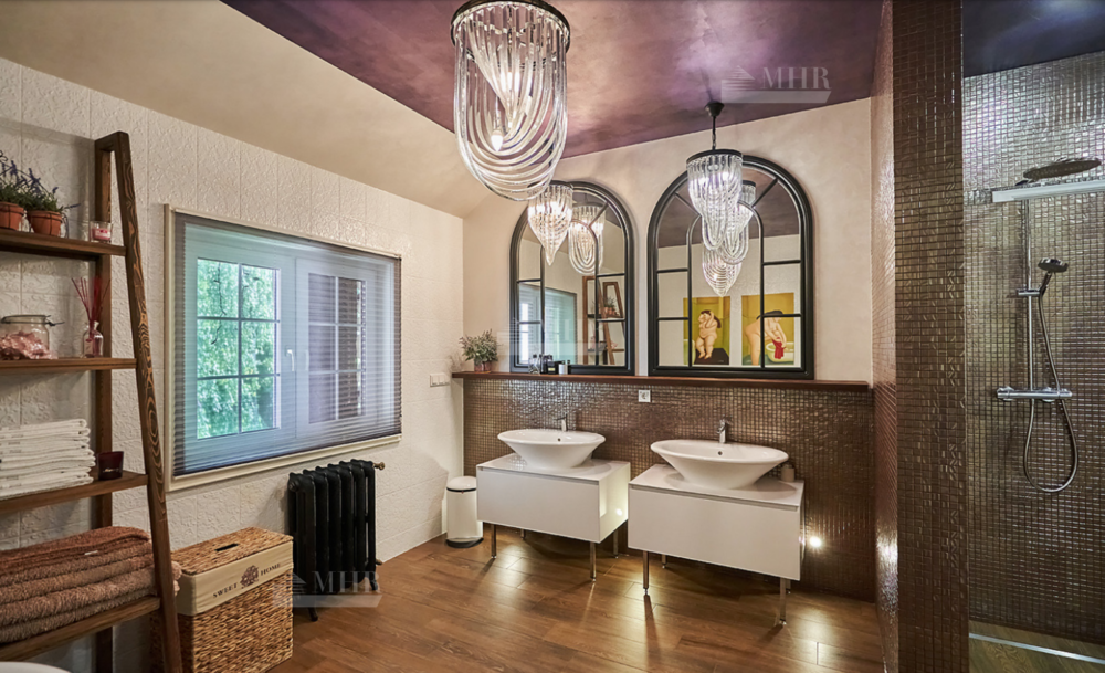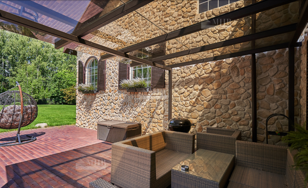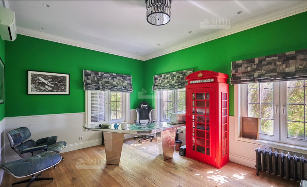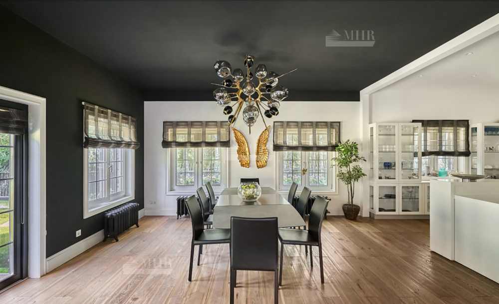 Внешний фасад дома - смесь американской и английской классики, большой гараж на 4 автомобиля, просторная территория. Функциональная планировка - гардеробные комнаты, 5 спален, большая входная группа, оформленная прозрачной смальтой. Сауна с зоной отдыха заслуживают отдельного внимания.