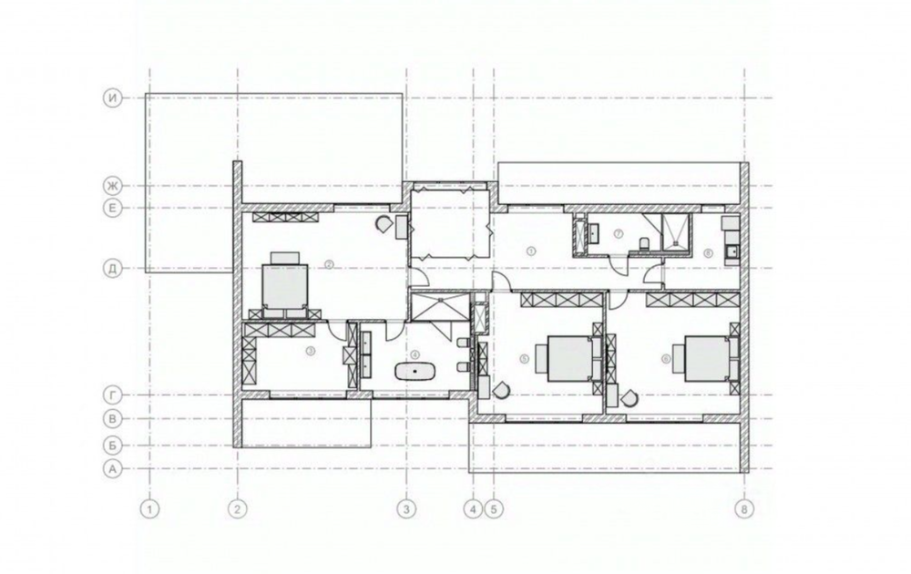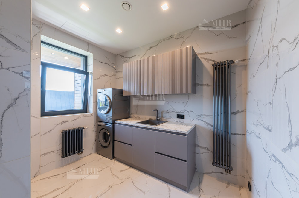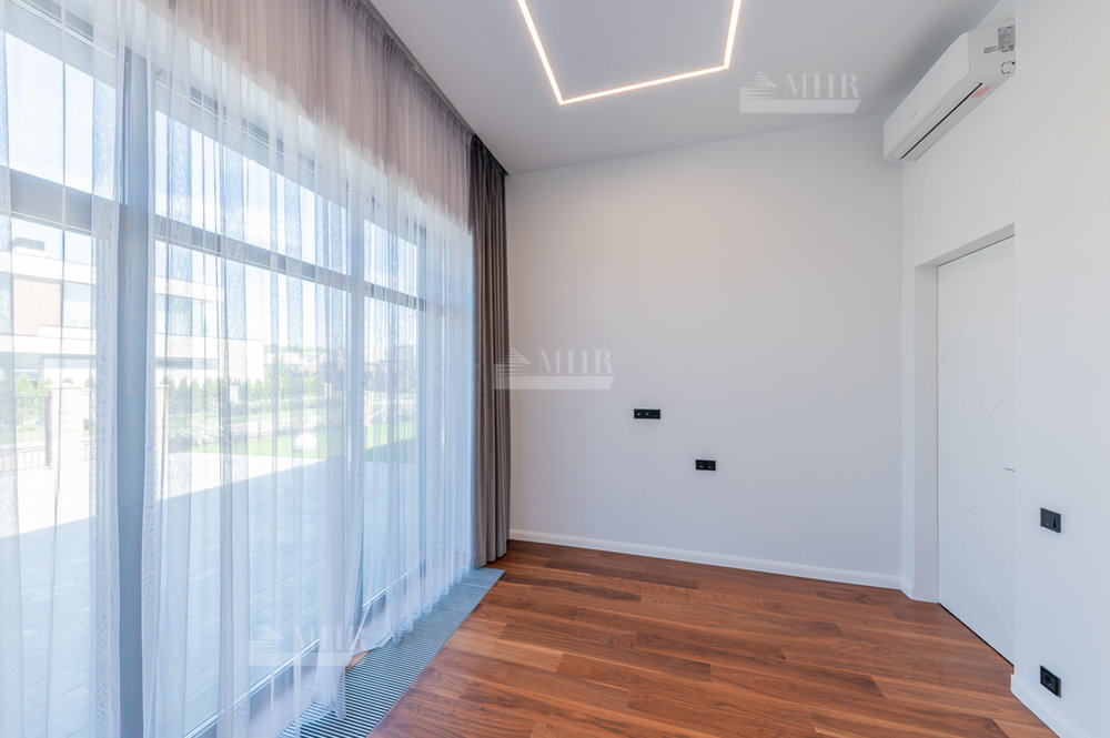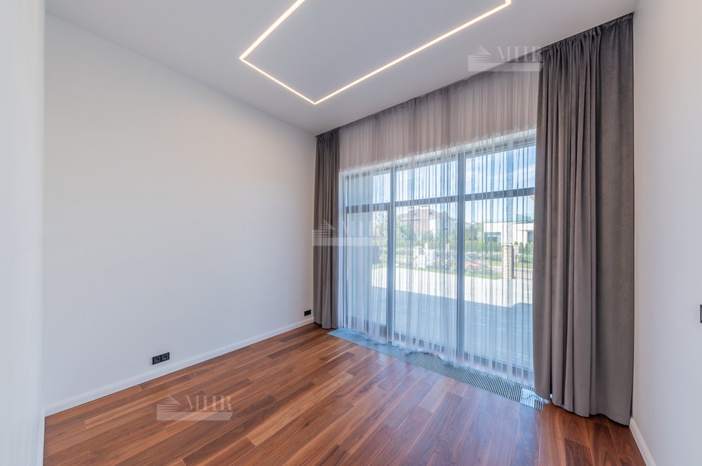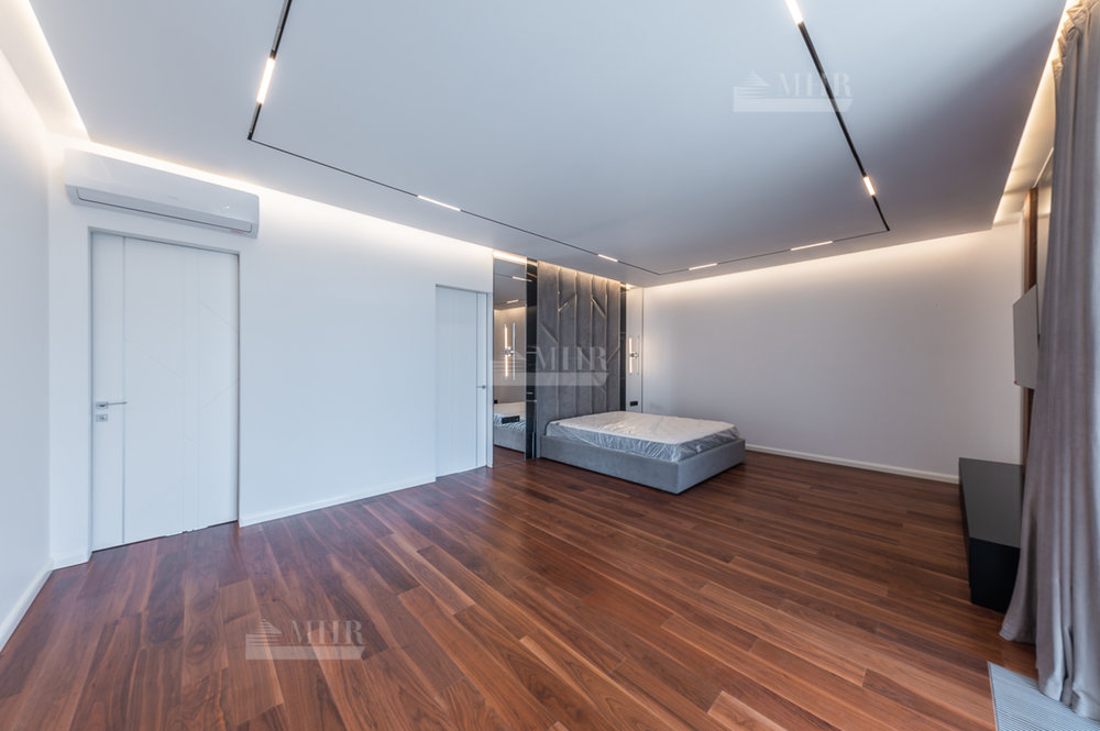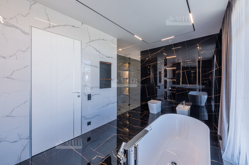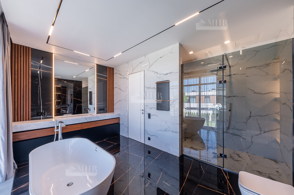 Зона отдыха представлена четырьмя спальнями. На втором этаже расположена шикарная мастер-спальня: комната занимает почти половину этажа, а из её ванной и гардеробной открывается панорамный вид на природу Новой Риги. Все ванные комнаты (одна на первом этаже и две на втором) оборудованы элитной немецкой сантехникой Villeroy&Boch.