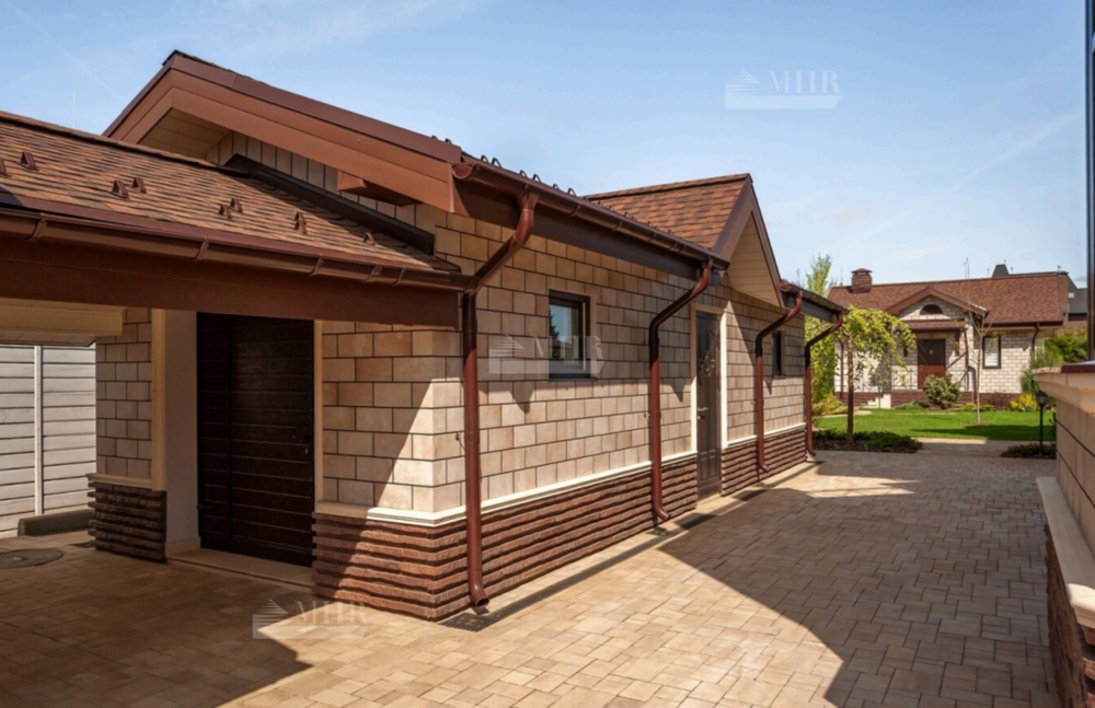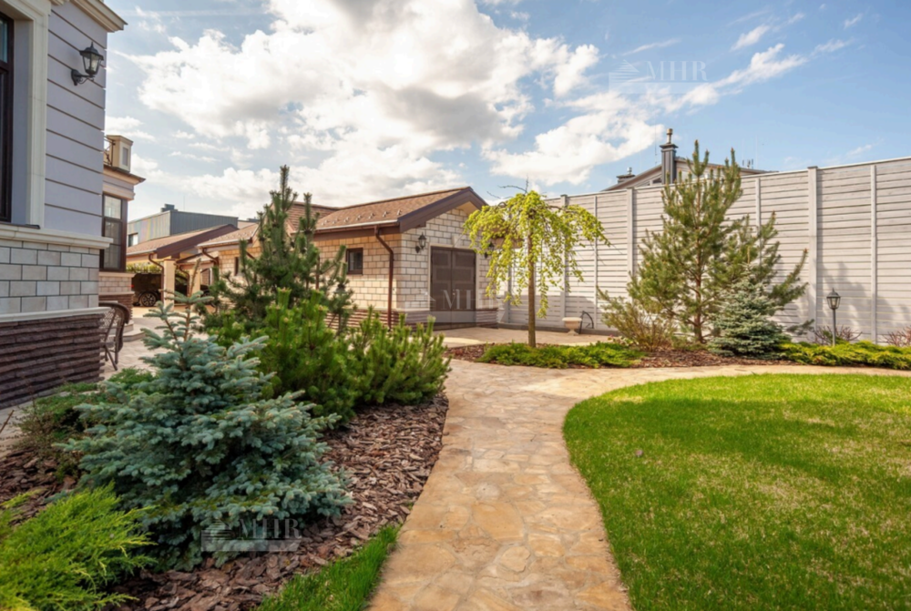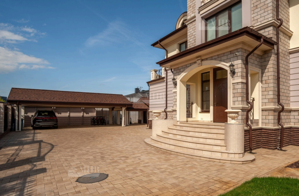 На участке установлен навес на три автомобиля, летняя веранда, полностью укомплектованная мебелью и кухонным гарнитуром, с зоной барбекю, просторный хоз. блок для инвентаря с тремя отдельными входами, установлена дренажная система и система автополива, высажены туи, кустарники и плодовые деревья.