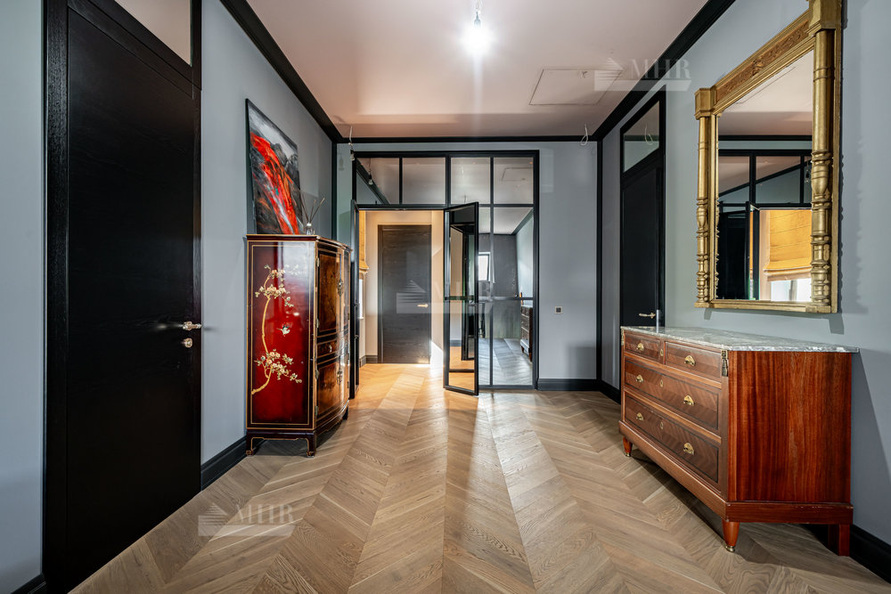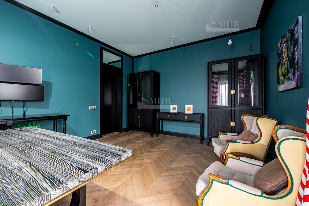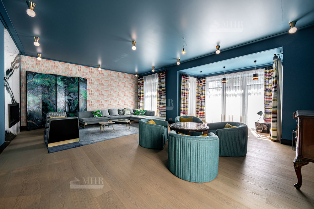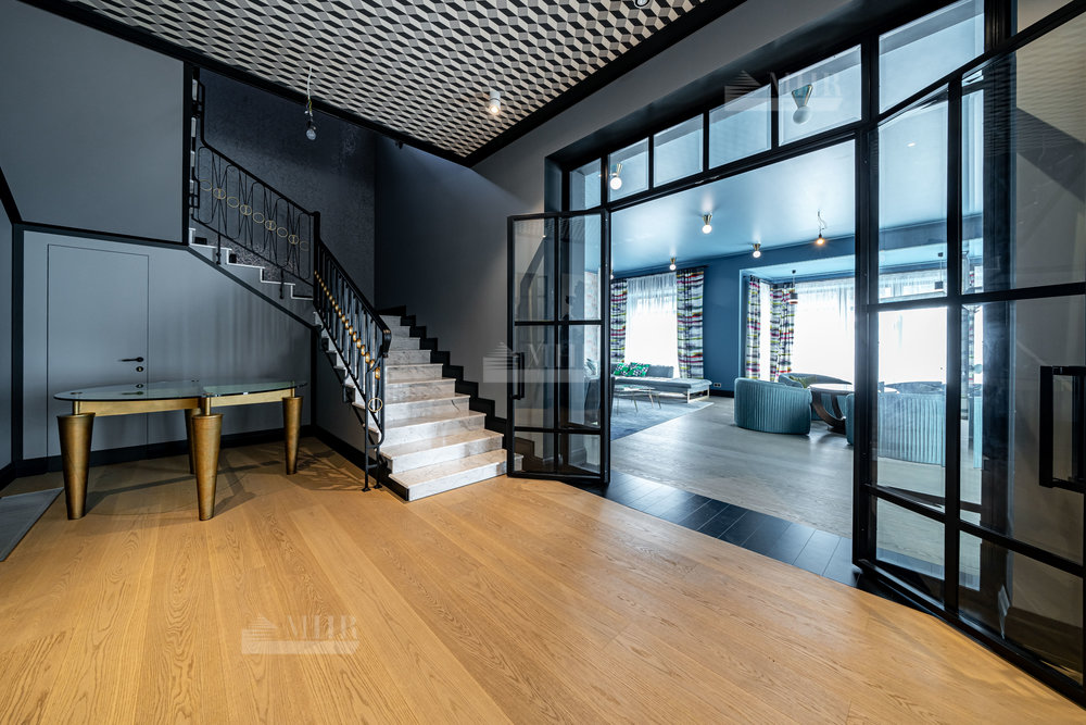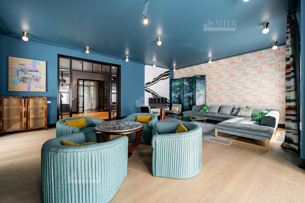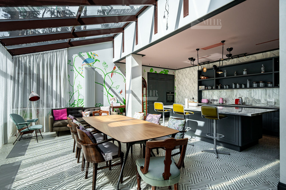 Особняк выполнен с отделкой  "под ключ" с использованием качественных материалов и укомплектован винтажной мебелью бренда Repeat Story. В интерьере представлены предметы от немецкого Werner West, датского E. Johannesen, а также мебель Италии и Голландии. Панорамное остекление по всему дому обеспечивает обилие естественного света, создавая уютную атмосферу даже в пасмурные дни.