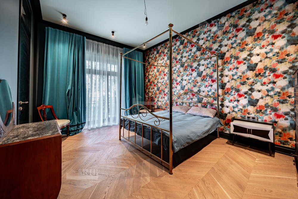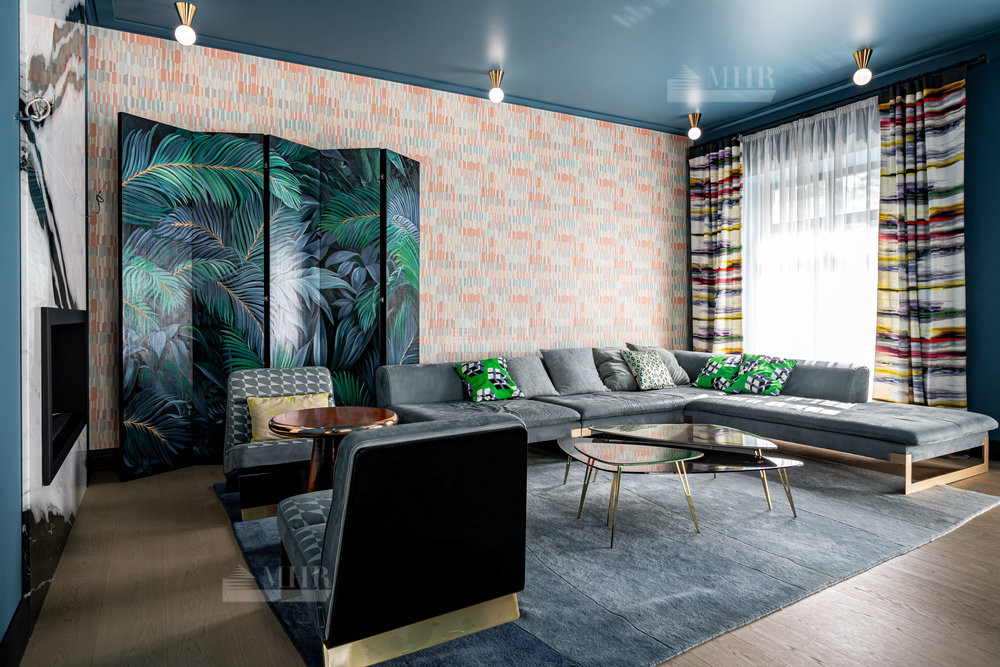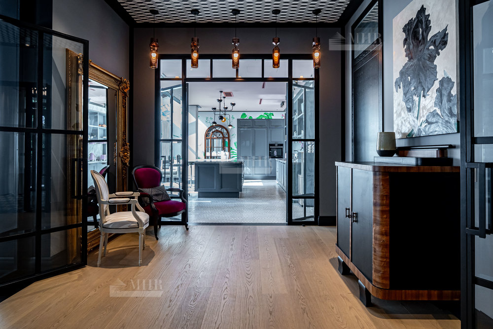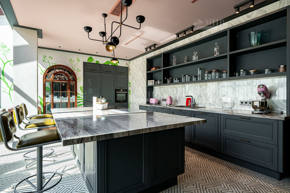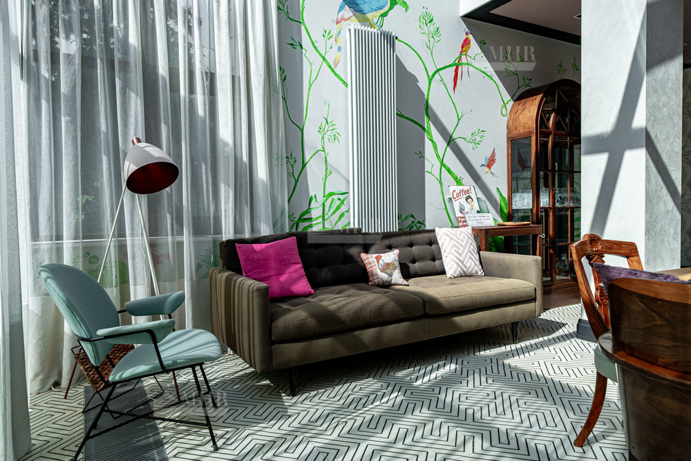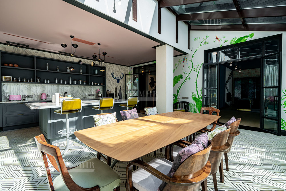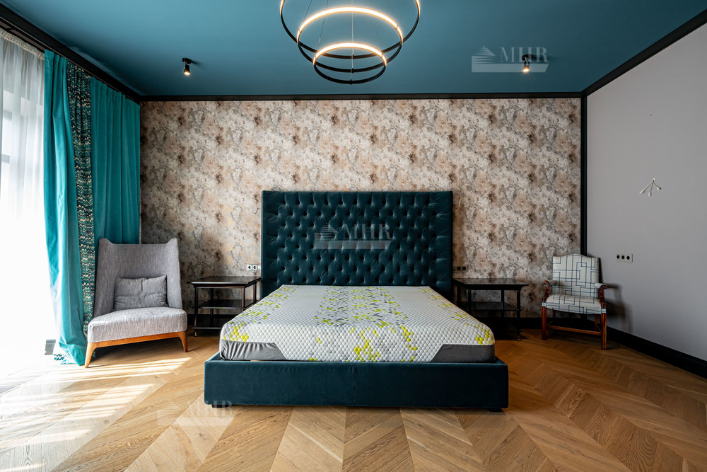 Особняк выполнен с отделкой  "под ключ" с использованием качественных материалов и укомплектован винтажной мебелью бренда Repeat Story. В интерьере представлены предметы от немецкого Werner West, датского E. Johannesen, а также мебель Италии и Голландии. Панорамное остекление по всему дому обеспечивает обилие естественного света, создавая уютную атмосферу даже в пасмурные дни.