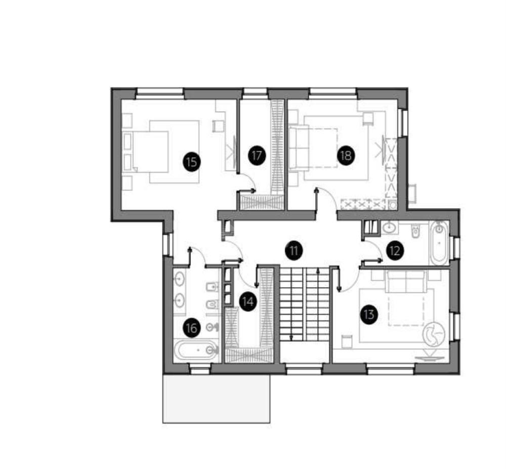 2-й этаж: 2 спальни со своими с/у и гардеробными, спальня, с/у, гардеробная.