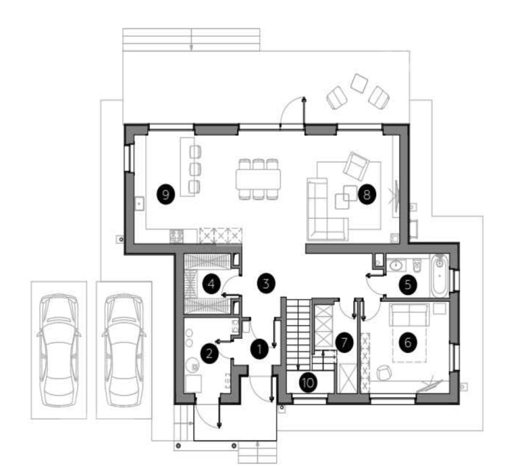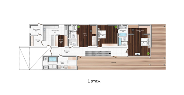 1-й этаж: прихожая, холл, гардеробная, с/у, гостиная, кухня-столовая, кабинет-спальня, кладовая, котельная, терраса;