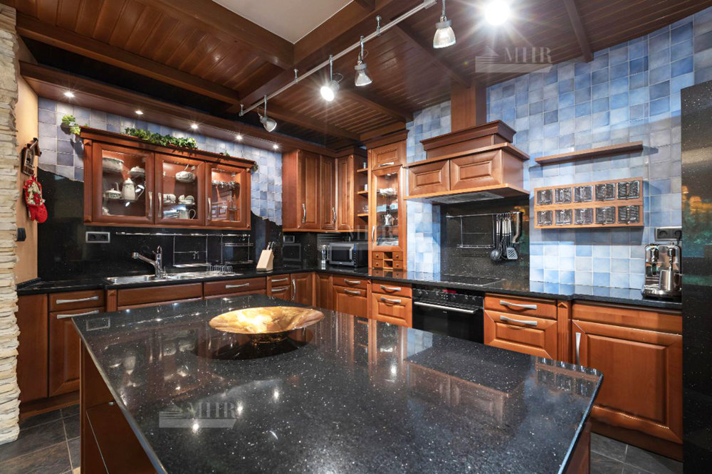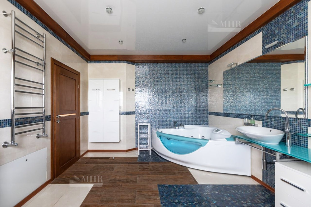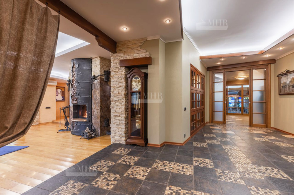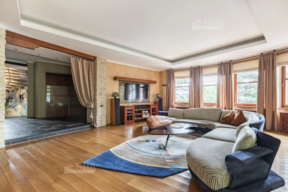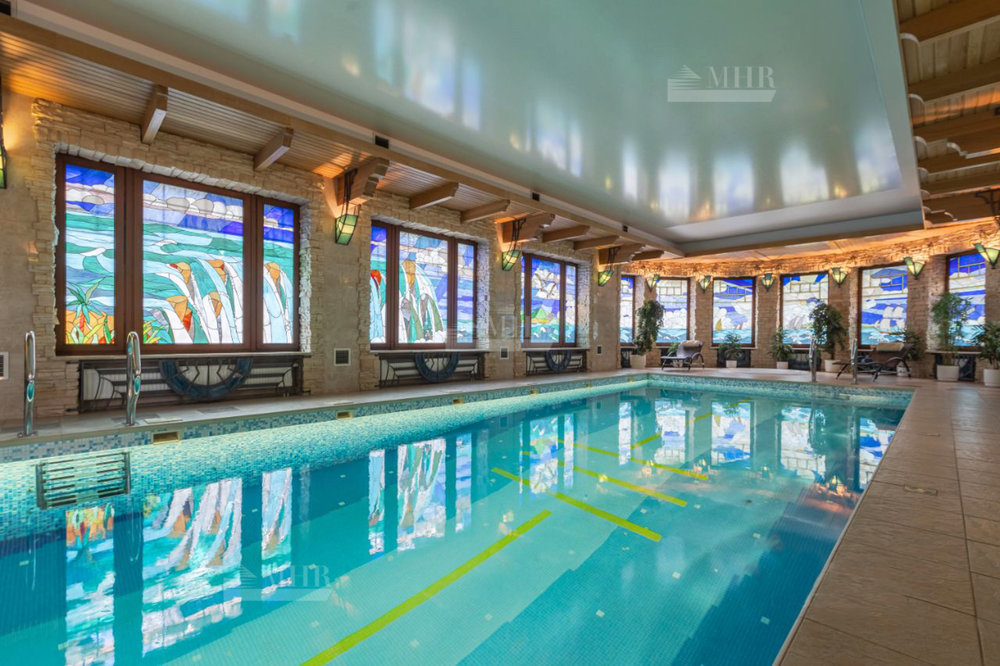 1 этаж: центральная гостиная с камином авторского исполнения, обеденная зона с кухней, гостевой с/у. Спа-зона с выходом на террасу с видом на сад и корт, бассейн с витражными окнами, финская сауна, джакузи, комната отдыха, душевая и с/у, теплый гараж с входом в дом.