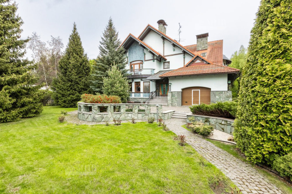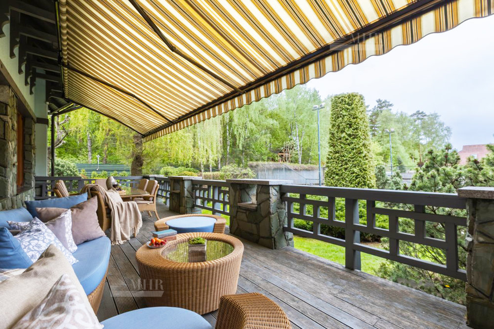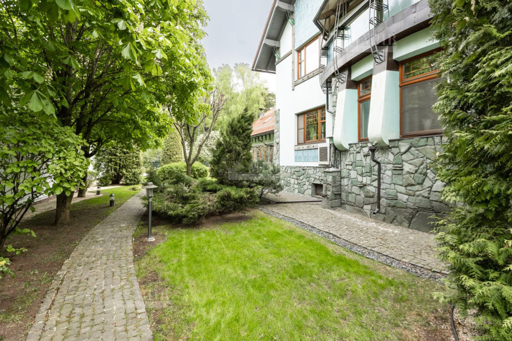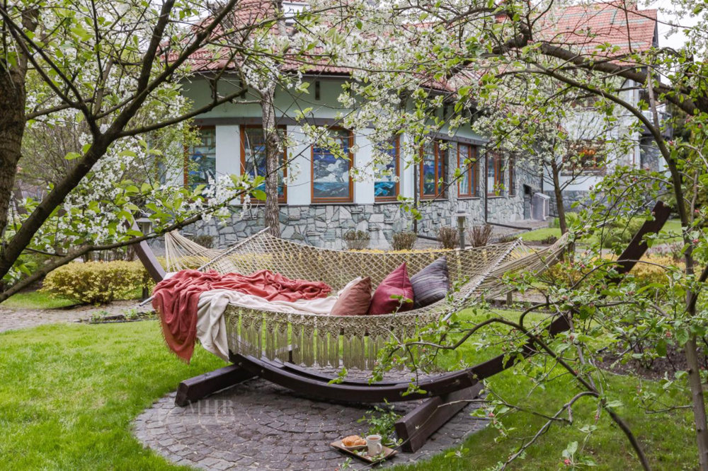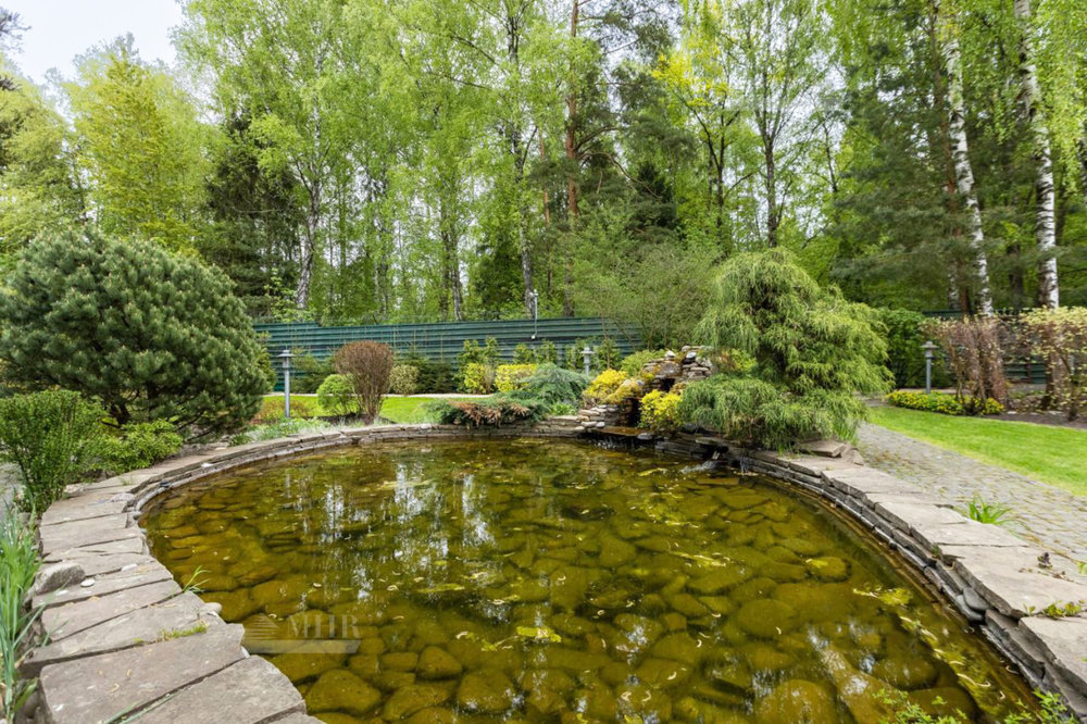 Сад с фруктовыми деревьями и парковая зона с ландшафтным дизайном, пруд с водопадом, грунтовый теннисный корт, вольер для собак.