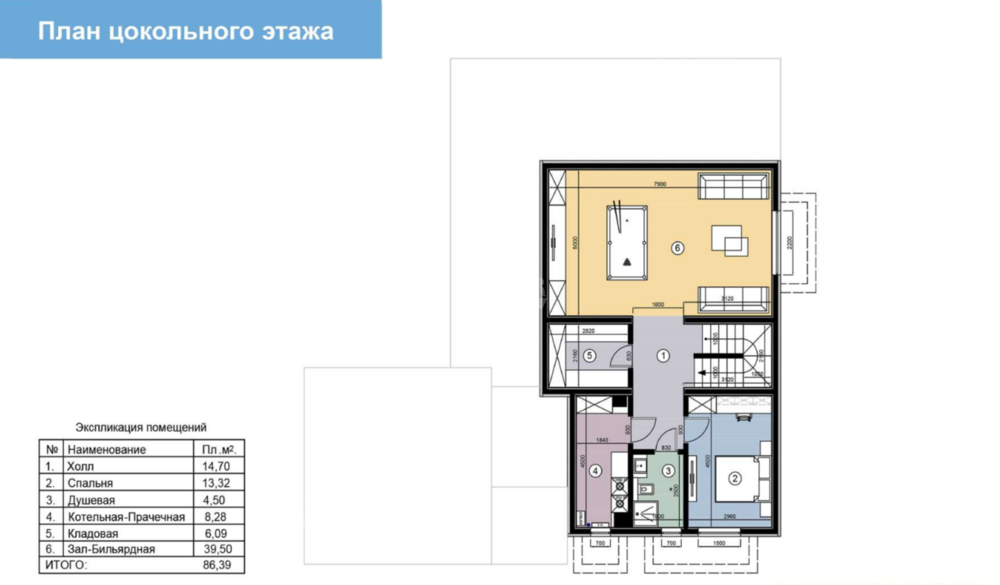 Цоколь: хоз. блок, спортзал или зона отдыха (игровая комната), комната для персонала, прачечная.
