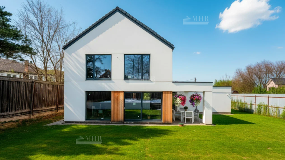 Выступающий перед входной зоной гараж, а также оформленная со стороны сада терраса и зона барбекю, интересно интегрированные в корпус постройки, придавая ей необычную форму. Современный характер дома подчеркнут соответствующей отделкой фасада, модные цвета штукатурки и натуральная облицовка создают эффектную и элегантную композицию. В пространство зоны первого этажа гармонично вписаны уютная гостиная с камином, столовая и кухня. Панорамное раздвижное остекление плавно соединяет интерьер с садом и является эффектным элементом аранжировки. В шаговой доступности Cambridge school, спортивный комплекс.
