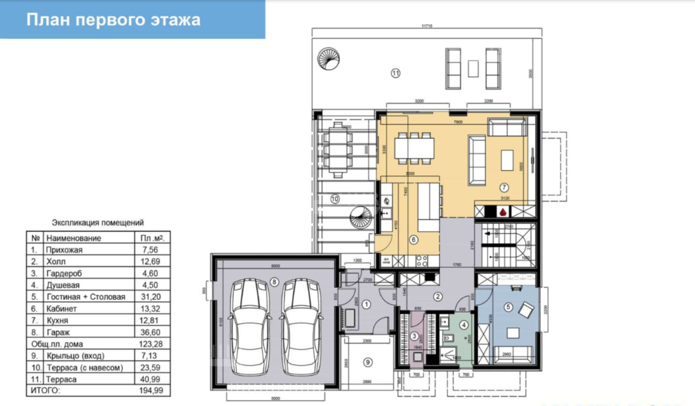 1 этаж: прихожая с выходом на террасу, гараж на 2 м/м, гардеробная, гостевой с/у, кабинет (комната для гостей), гостиная, кухня с островком, столовая, предусмотрен камин.