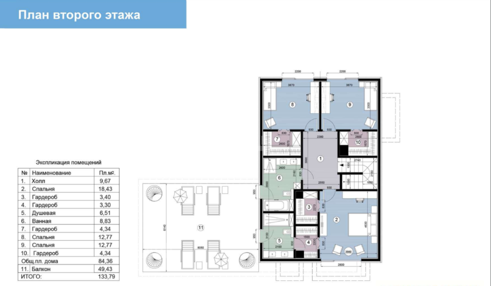 2 этаж: мастер-спальня, 2 гардеробные, ванная комната, с/у, выход на эксплуатируемую кровлю, 2 детские комнаты (зеркальные), ванная комната, душевая, с/у.
