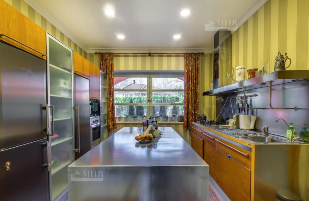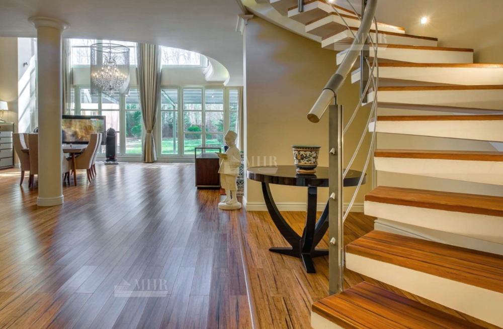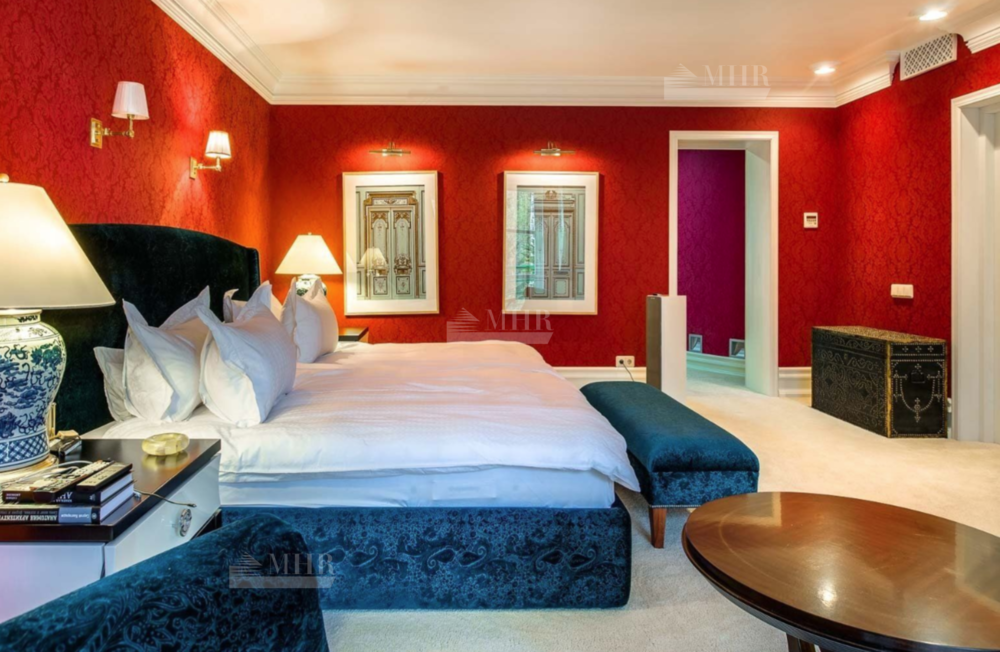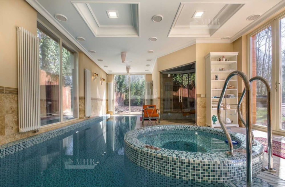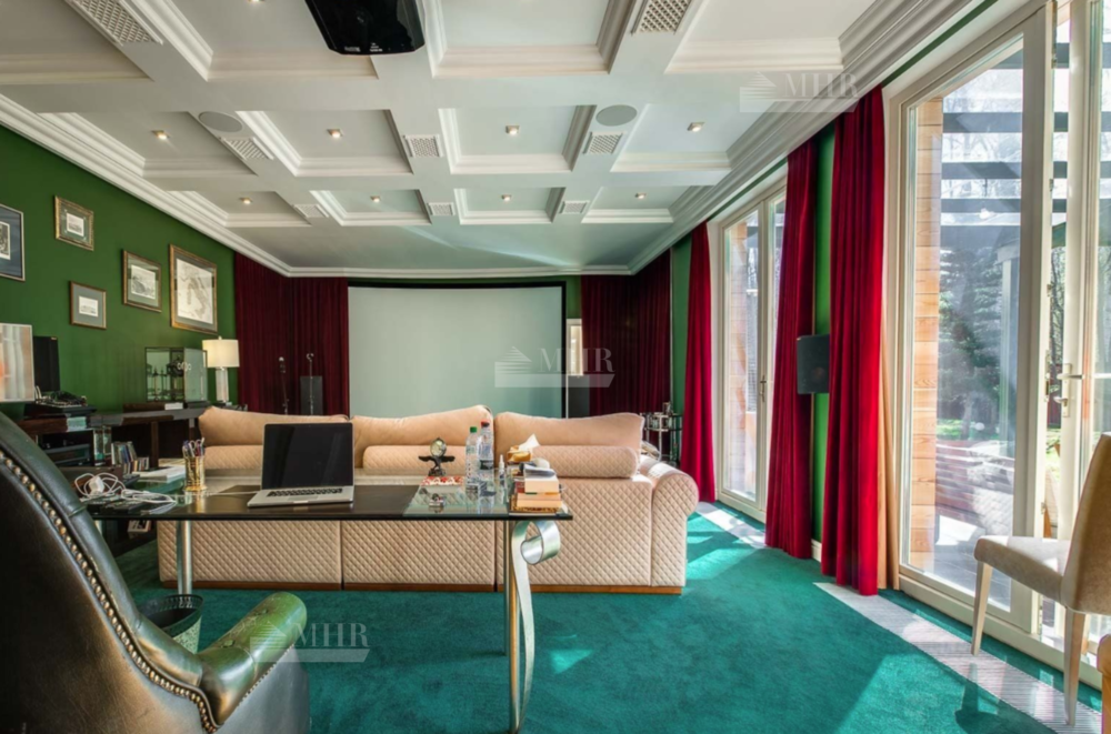 1 этаж: Холл, гардеробная, санузел, гостиная с камином, вторым светом и выходом на участок, кухня, столовая, санузел, кинотеатр, бассейн 10 м, джакузи, хаммам, душевая, санузел, квартира для персонала, постирочная, гардеробная, комната для охраны.
