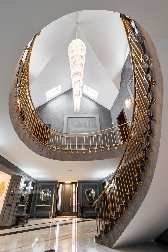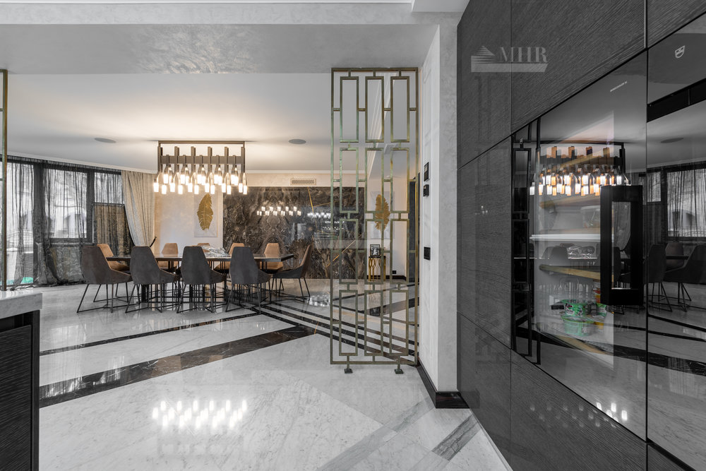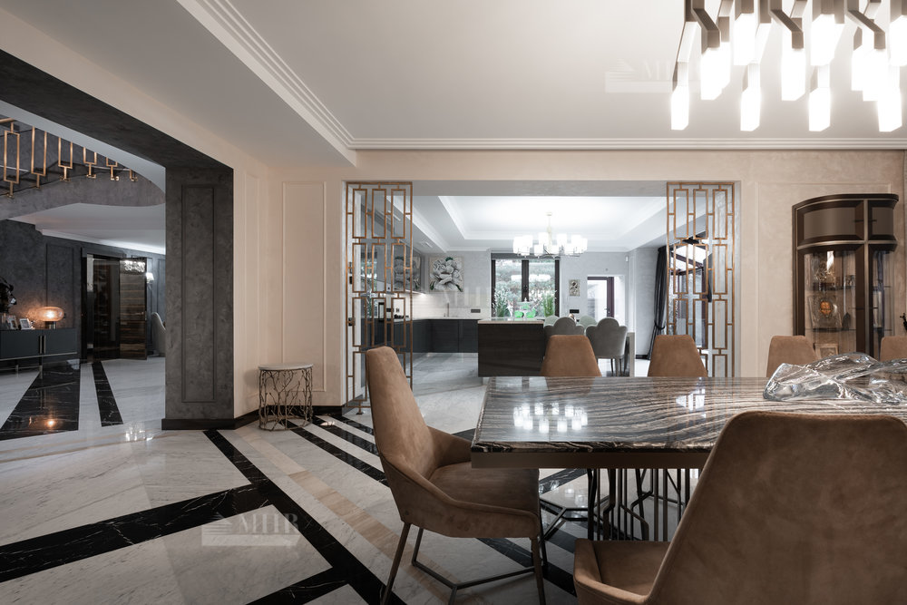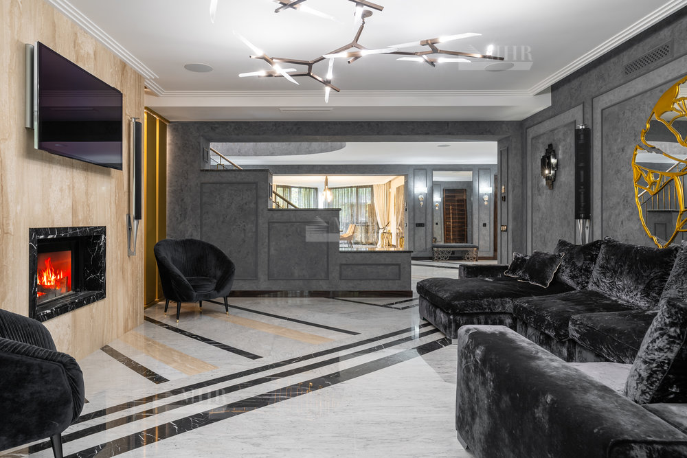 1-й этаж: прихожая, гардеробная, холл, санузел, гостиная, камин, лаунж зона, столовая, кухня, кабинет;