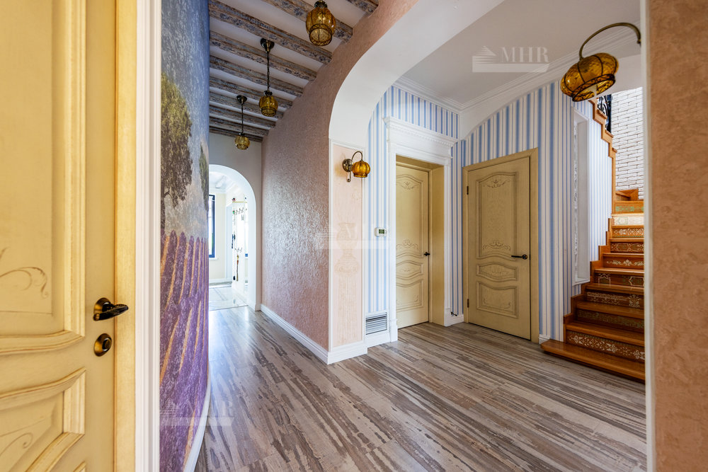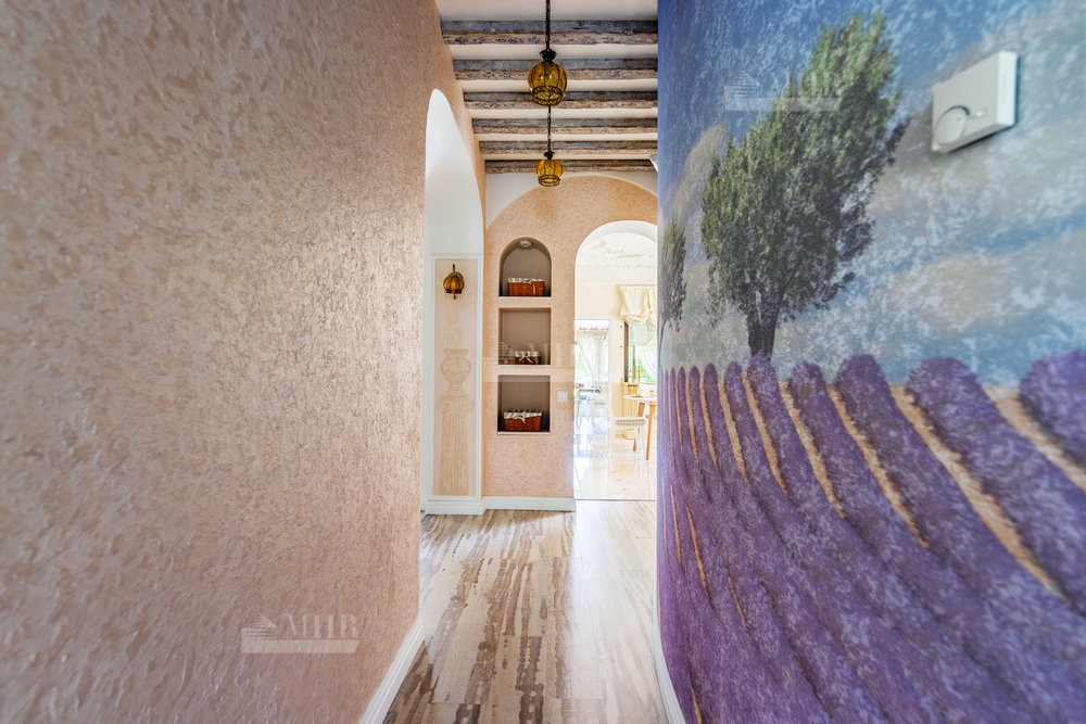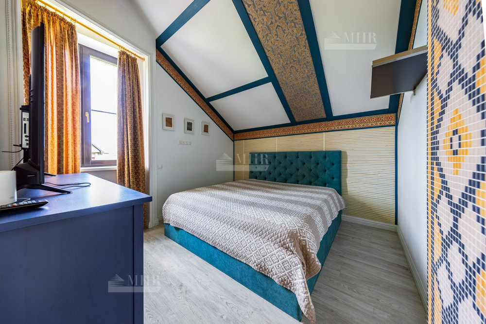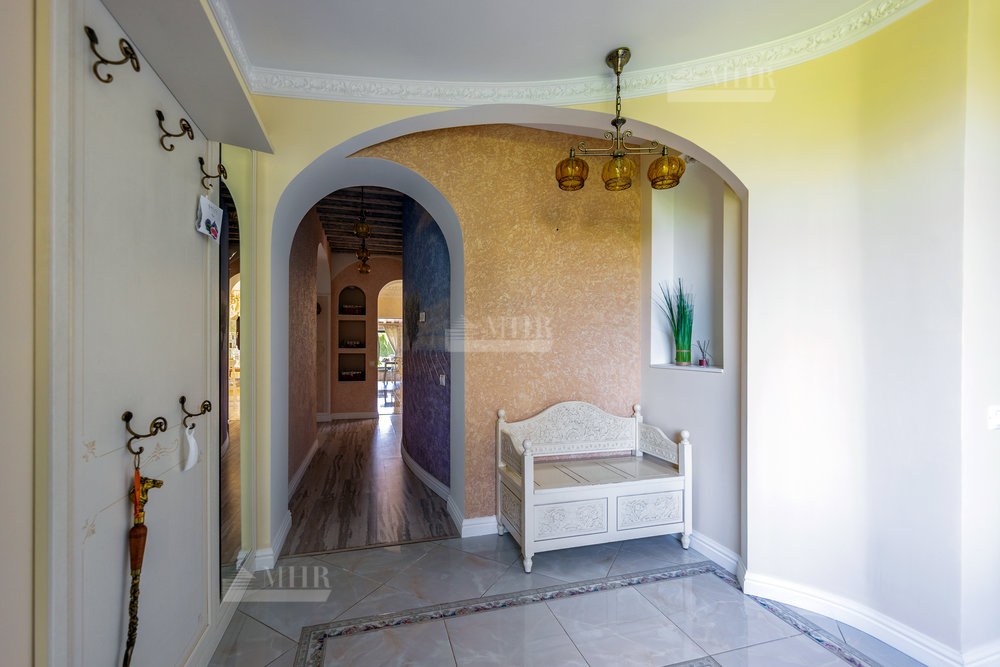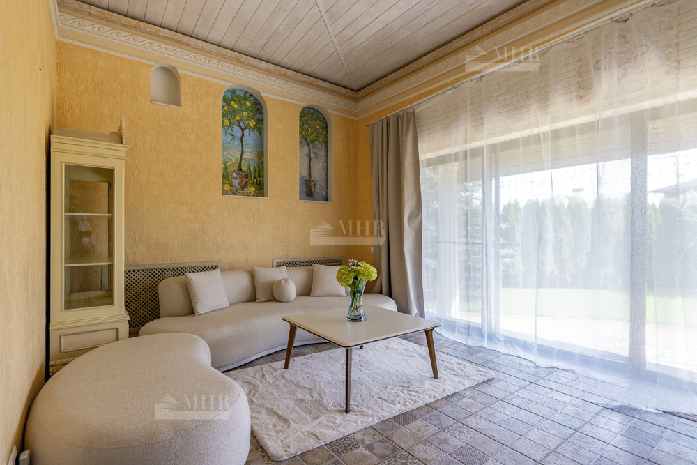 Дом выполнен в стиле прованс с ручной росписью, в светлых тонах, с большими витражными окнами с видом на ухоженный зеленый сад и многолетние туи. Обставлен новой мебелью и техникой 2025 года.
