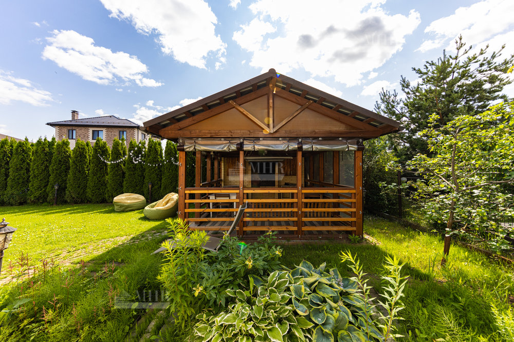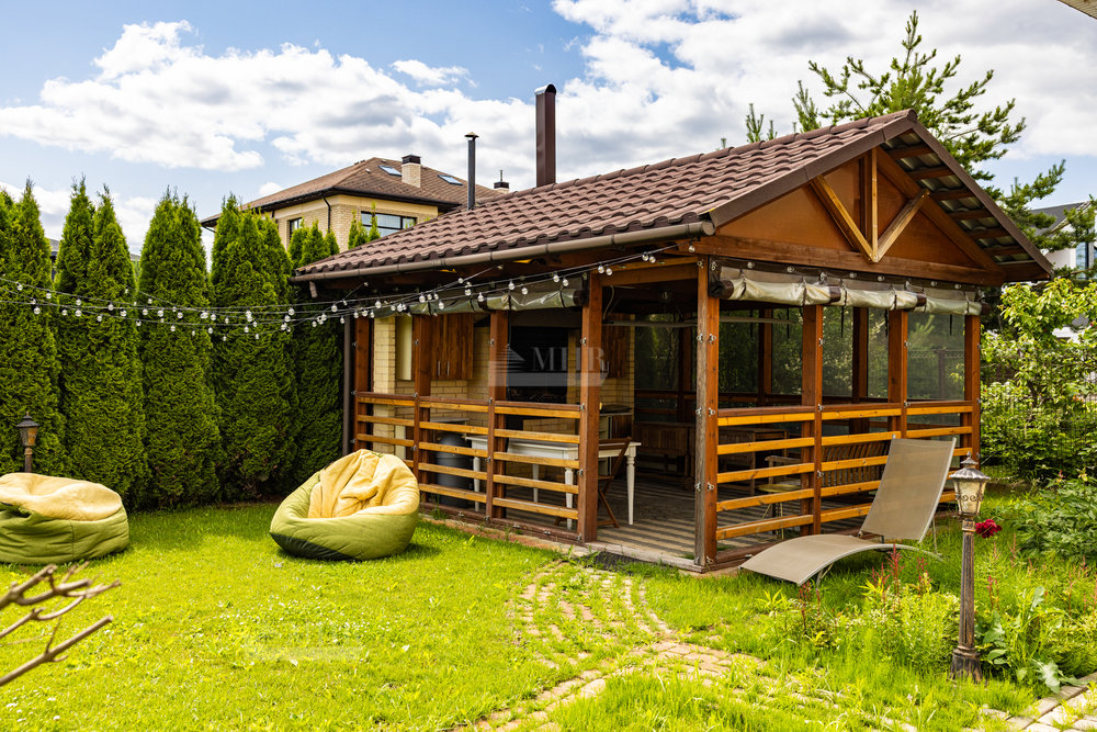 На участке расположены: отдельная кладовая для садовой техники и велосипедов, баня с кухней, парилкой и душевой, большой подогреваемый чан для купания даже зимой, крытая беседка с мангалом для шашлыка и казана, гостевой дом с кроватью, полноценной кухней с плитой и духовкой, стиральной машиной, душевой и санузлом, с отдельным входом, парковка с навесом для нескольких машин.