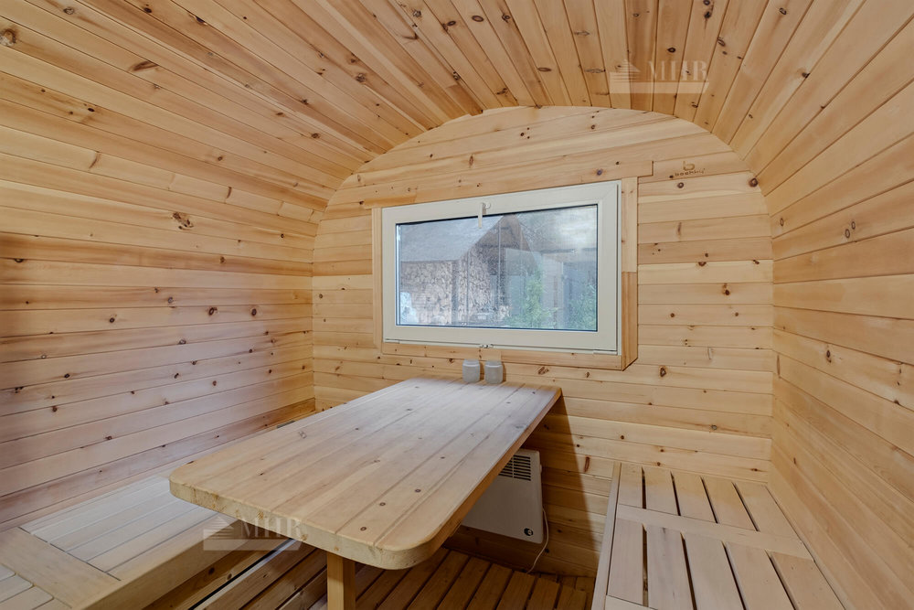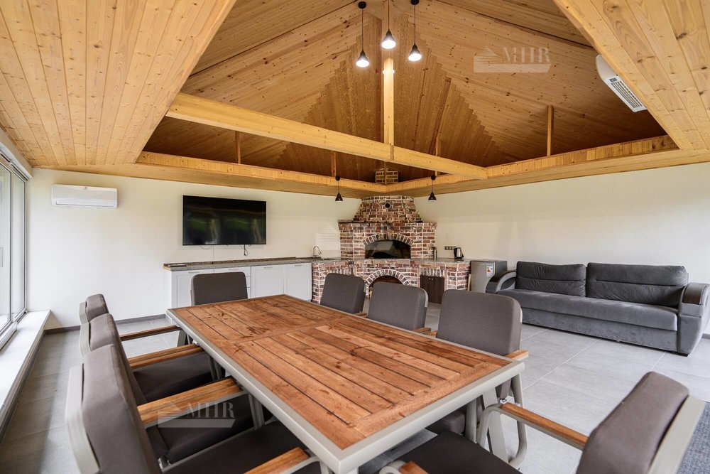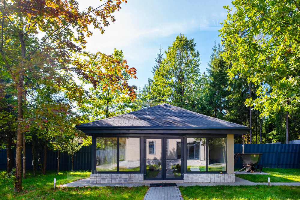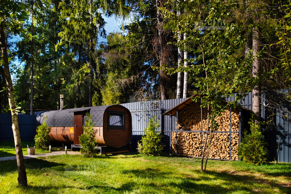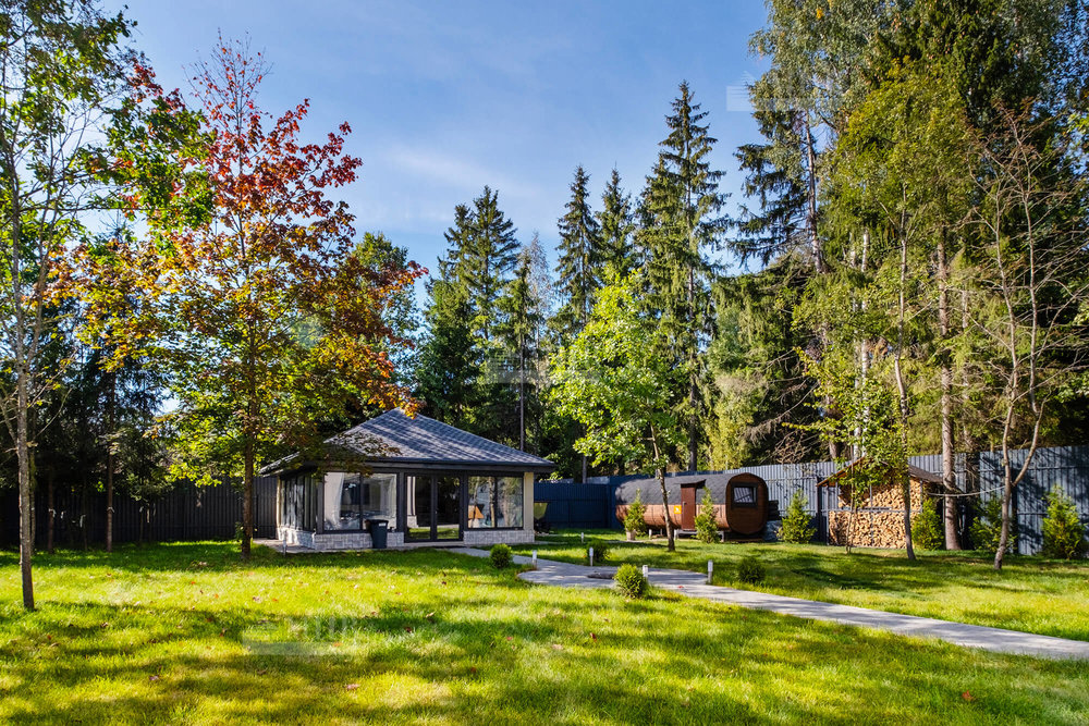 Участок со взрослыми деревьями, на нём расположились: шикарная застеклённая беседка-барбекю с мини-кухней и дорогой обеденной группой, так же есть чан на дровах и баня-бочка.