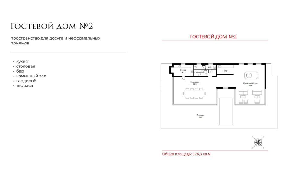 Гостевой дом №2: пространство для досуга и неформальных приемов: кухня, столовая, бар, каминный зал, гардероб, терраса.