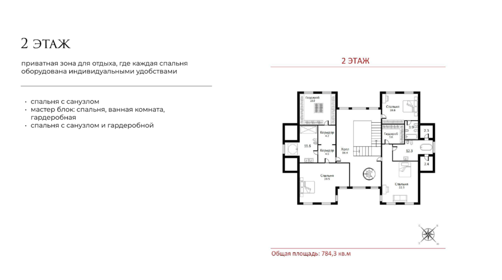 2-й этаж: приватная зона для отдыха, где каждая спальня оборудована индивидуальными удобствами: спальня с с/у, мастер блок: спальня, ванная комната, гардеробная, спальня с с/у и гардеробной.