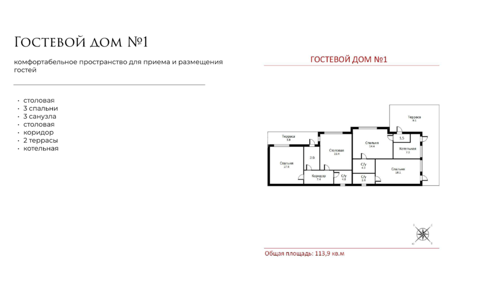 Гостевой дом №1: комфортное пространство для приема и размещения гостей: столовая, 3 спальни, 3 с/у, столовая, коридор, 2 террасы, котельная.