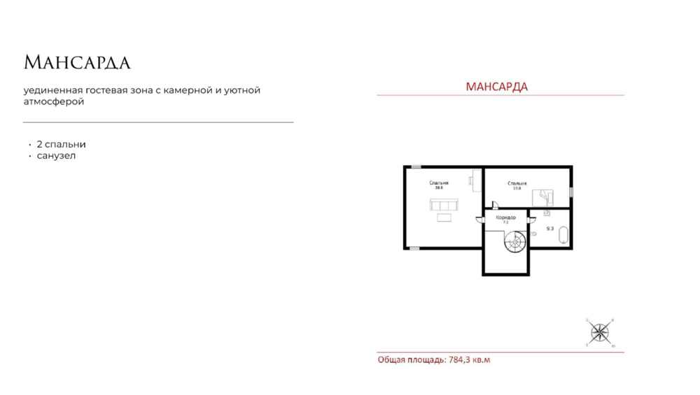 Мансарда: уединенная гостевая зона с камерной и уютной атмосферой: 2 спальни, с/у.