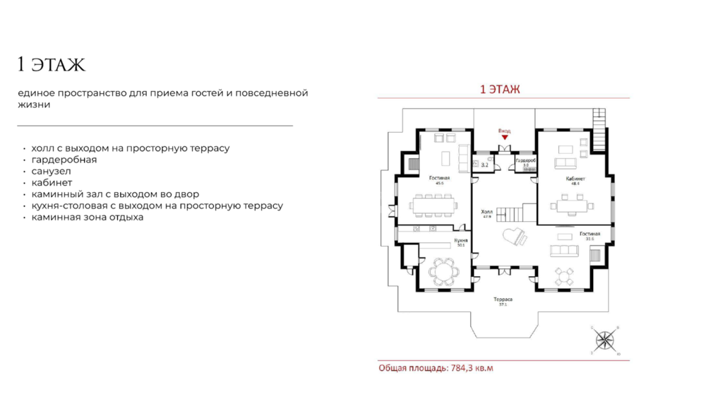 1-й этаж: холл с выходом на просторную террасу, гардеробная, с/у, кабинет, каминный зал с выходом во двор, кухня-столовая с выходом на просторную террасу, каминная зона отдыха;