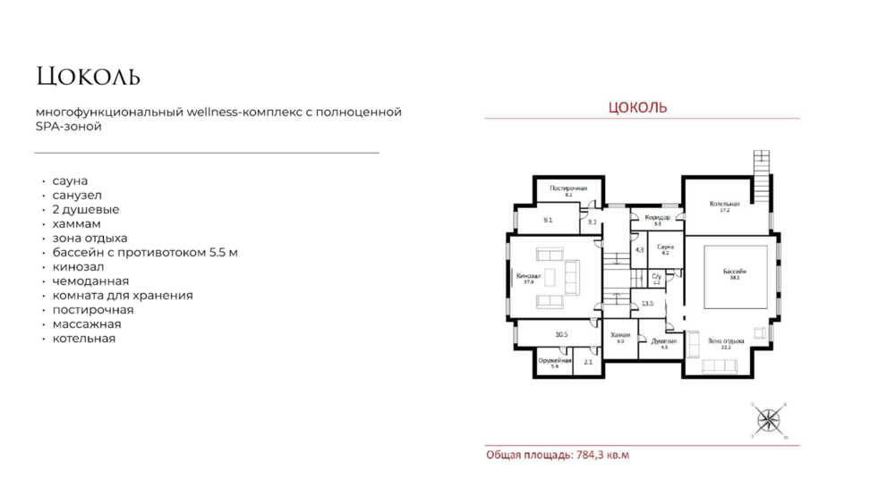 Цоколь: многофункциональный wellness-комплекс с полноценной SPA-зоной: сауна, с/у, 2 душевые, хаммам, зона отдыха, бассейн с противотоком, кинозал, чемоданная, комната  для хранения, постирочная, массажная, котельная.